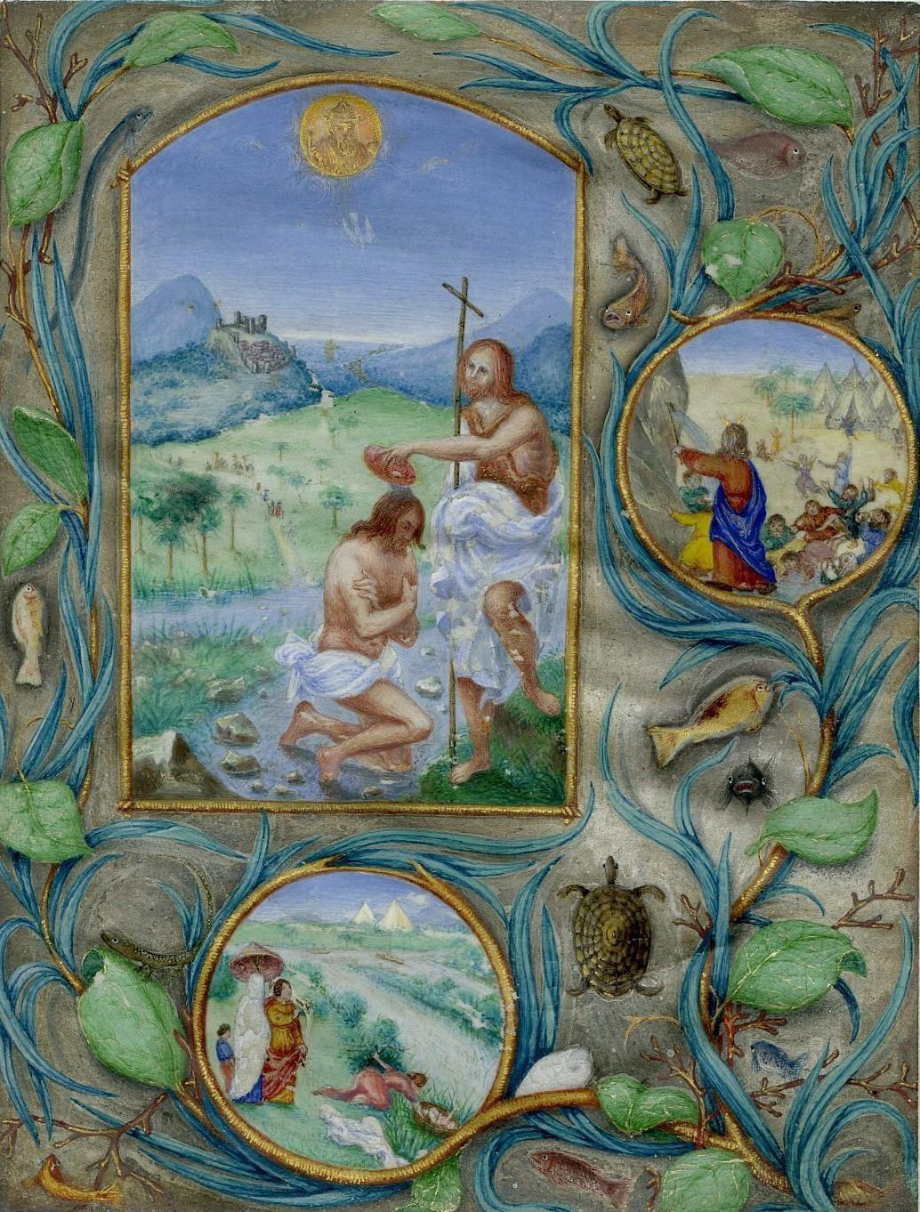 A second one is a leaf in a 16th-century Flemish style that I bought at Swann’s in which the artist ingeniously used aquatic themes in the borders surrounding the Baptism of Christ: fish and turtles swim among the plants, while in the two roundels Moses produces life-saving water when he strikes the rock, and Pharaoh’s daughter finds Moses in the bullrushes of the Nile. The latter, remarkably, includes the pyramids of Giza!