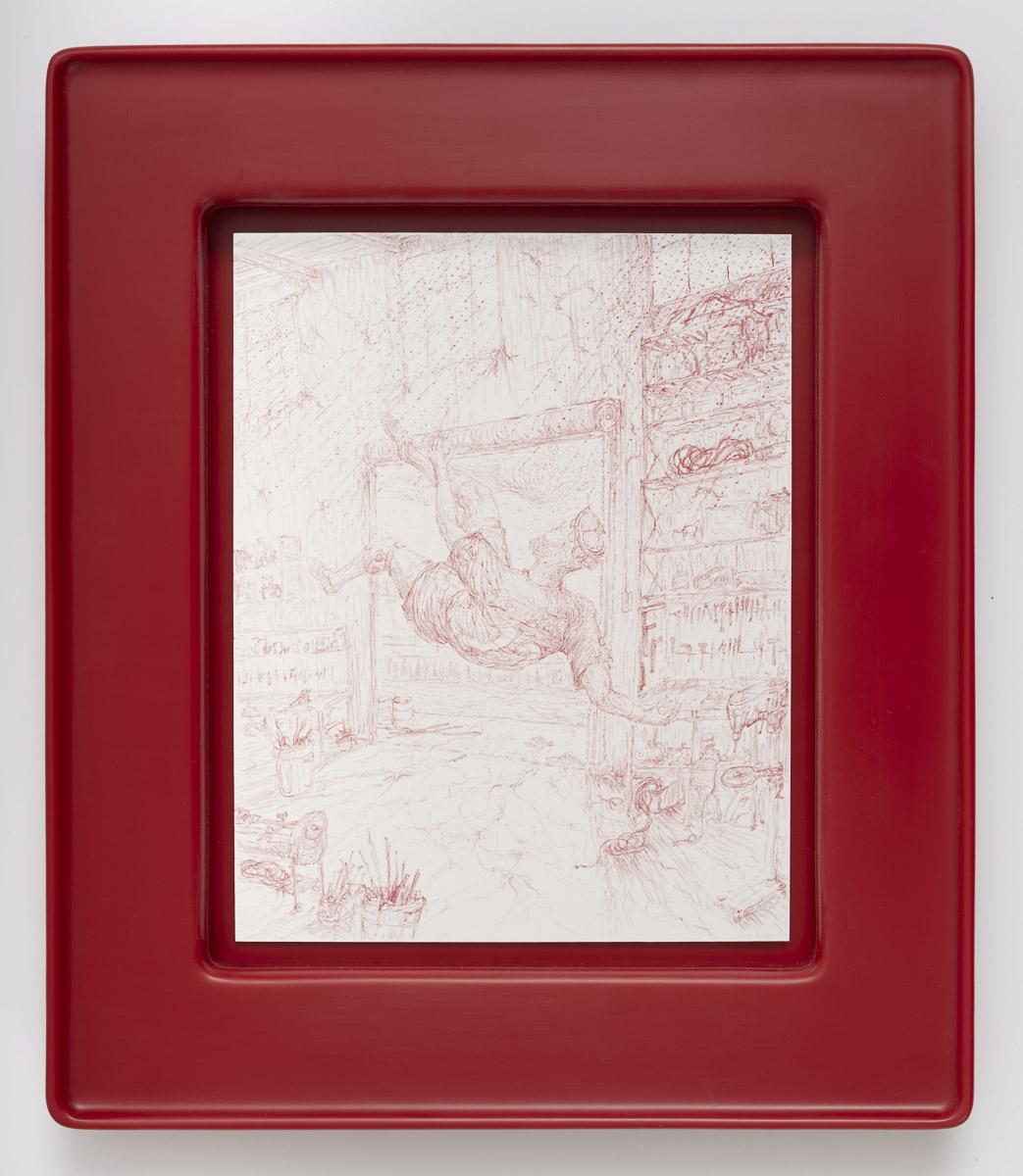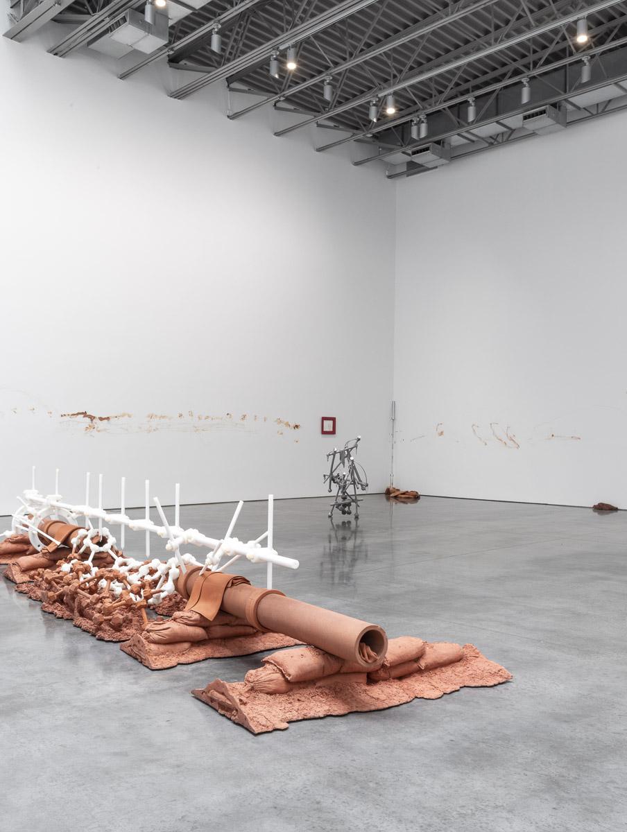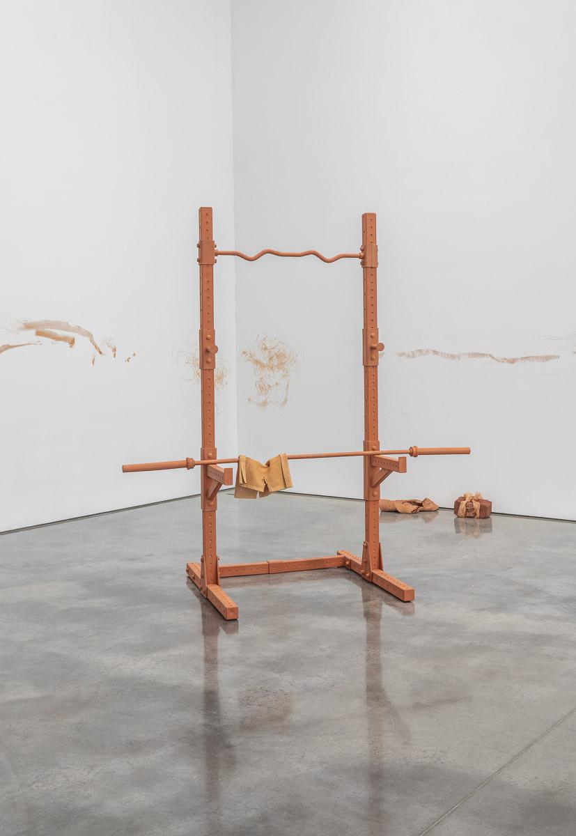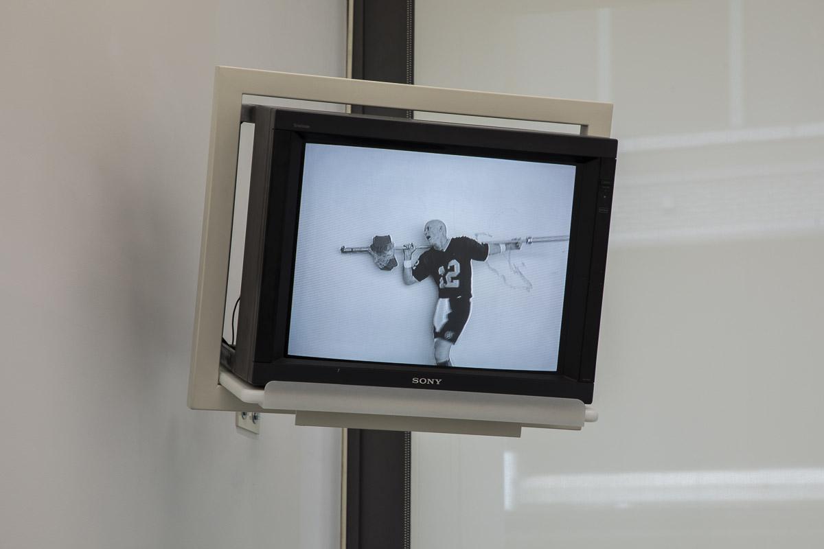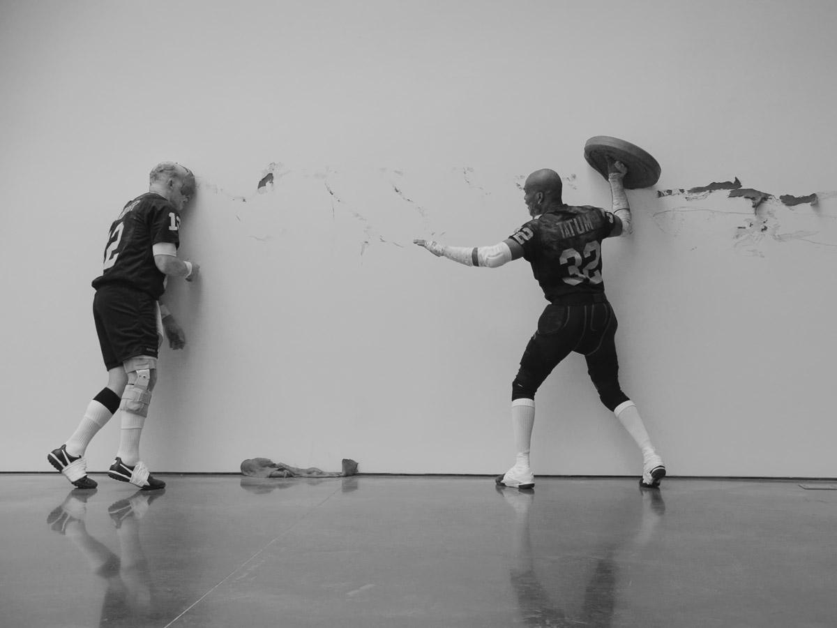 At Gladstone Gallery in New York, a black and white video on a small television monitor replays actions that the artist (in a number 12 football jersey) and another man (in a number 32 football jersey, with the surname Tatum on the back) performed in the space. Each carries a weighted object made of red clay, dragging it on the wall with the intention of mark-making.