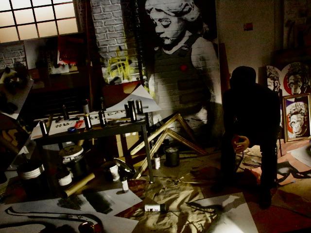 Installation view of Banksy: Genius or Vandal? featuring diorama of Banksy's studio based on images from Exit Through the Gift Shop.