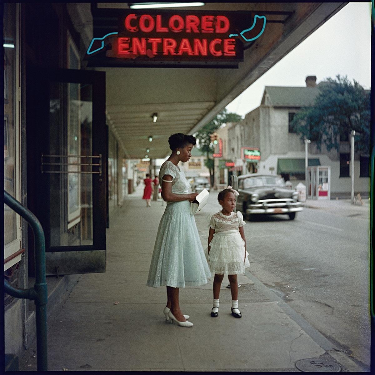 The piece that drew me in, was Department Store, Mobile, Alabama. For me as a mother, I think about the conflict with daughters. I think about what it must have felt like for her. This was her niece. Had this little girl ever been to a formal theater before? Does the aunt now have to decide if she should bring her into the colored entrance, or should they skip it all together? Do they expose her to the evils of racism, segregation, subjegation, discrimination? All of those things, she would seemingly be protected from, at home. Or maybe today is the day you have to explain this to her, that some people don’t believe she is worthy of going in front. So it was the beauty of it: the woman, girl, colors, clothing, the elegance. To me, she’s the height of elegance, paired with the horror of the conflict at hand.