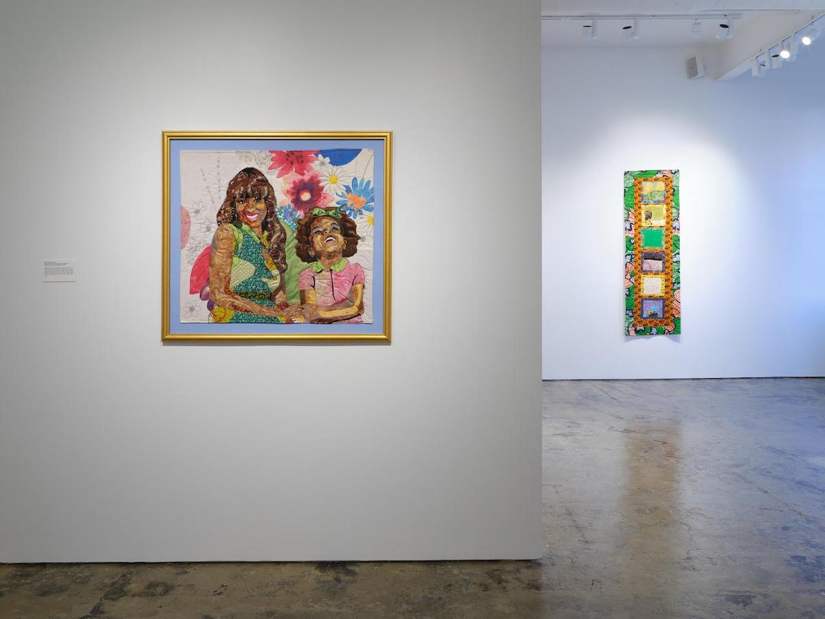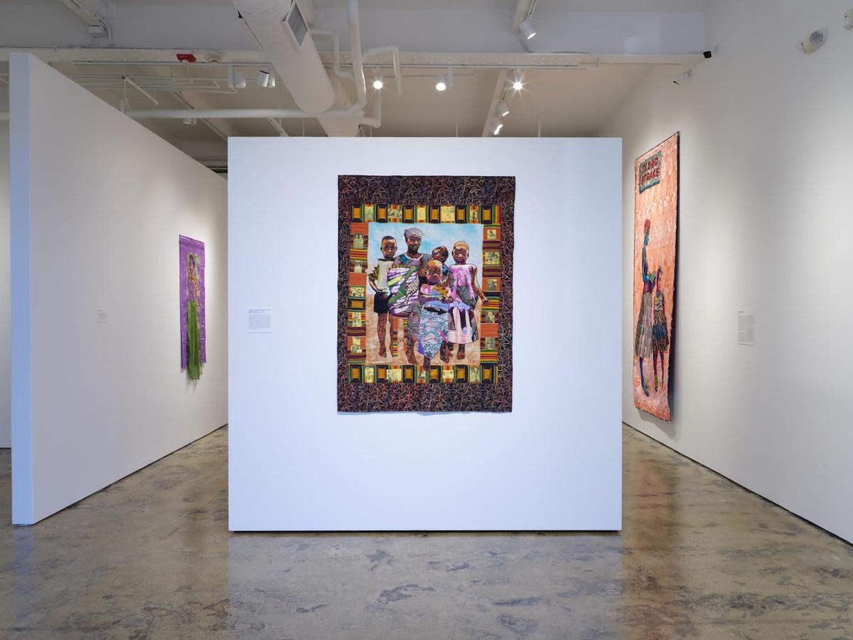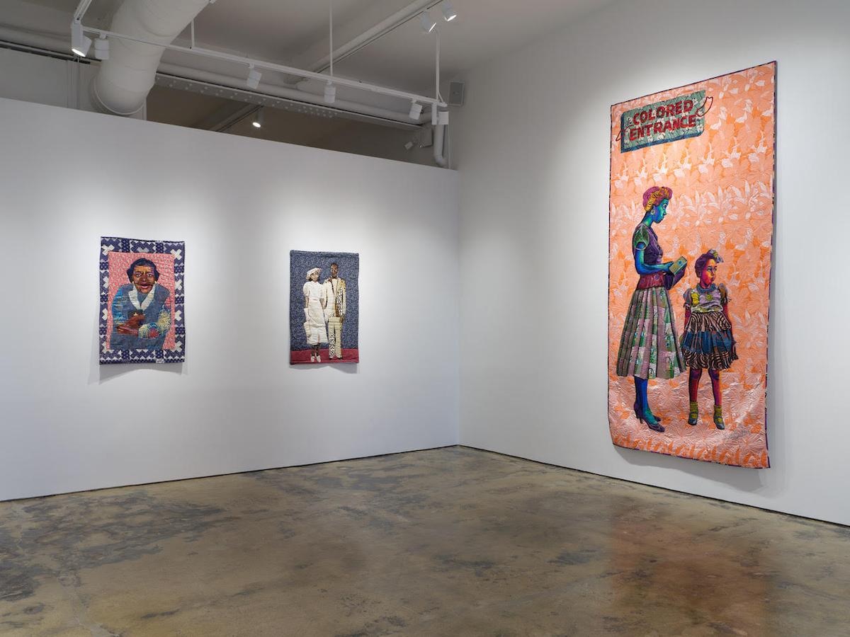 Installation view, Bisa Butler: Materfamilias, Gordon Parks Foundation. Works: Praise God, 2014, Wedding Portrait, 2001, Colored Entrance (after Department Store, Mobile, Alabama by Gordon Parks, 1956), 2023