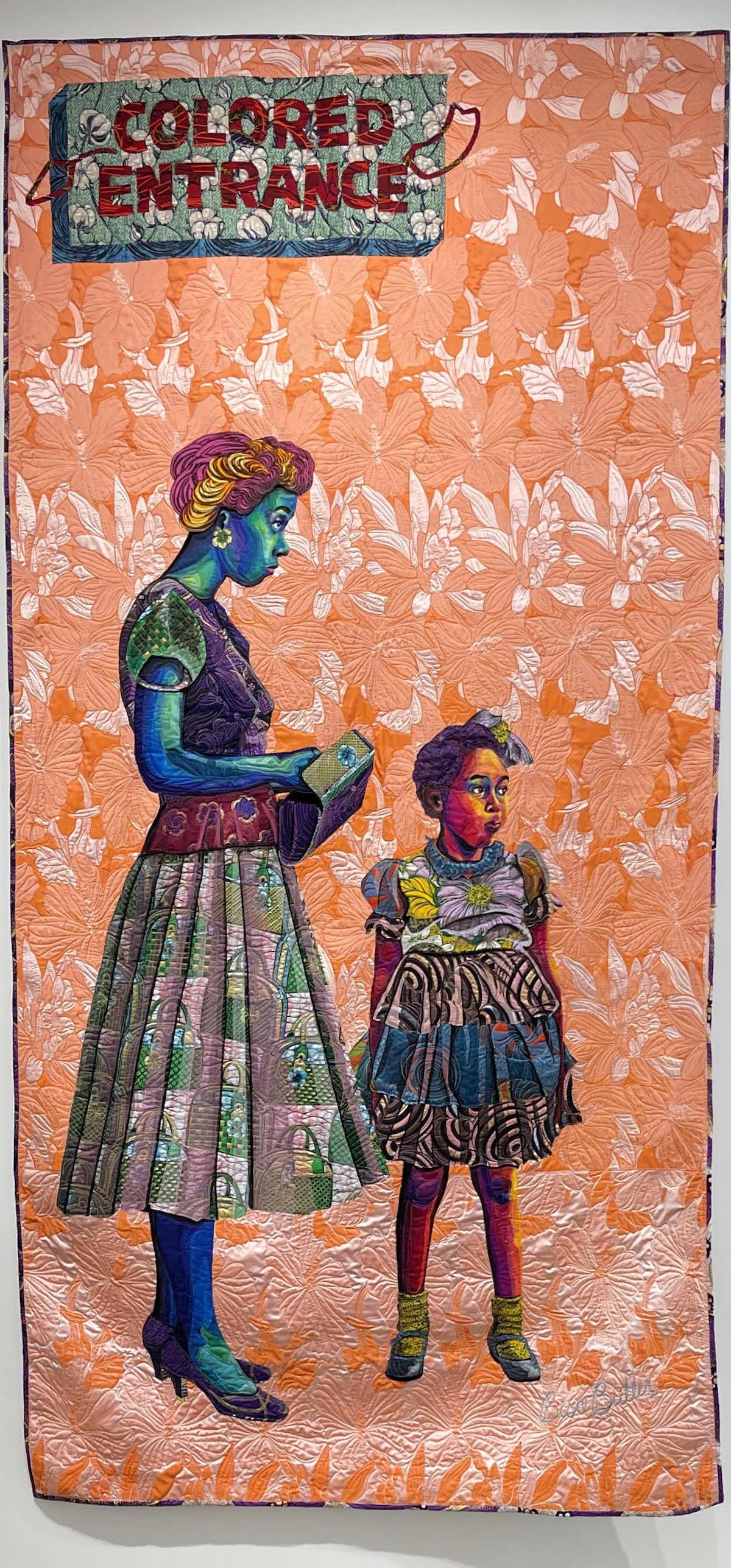 BB: I wanted the challenge of trying to tackle such a huge subject, but paring it down to get the essential message. I interpreted this image as in one direction by the theater door as going backwards toward racism, and on the right, I used a light orange floral fabric to represent promise. Where Parks had the woman and child looking toward the right, I felt that was the way toward salvation, freedom, quality, equitable society. Let's not go back to what America was, let's move forward into a place that we have not yet even reached to this day. And I wanted to reinforce that idea with the fabrics I chose for them. For example, the fabrics on the little girl are lighter – there are lollipops, spinning tops, and flowers on her. As a child, I wanted her to have fun things, she can deal with adult matters later.
