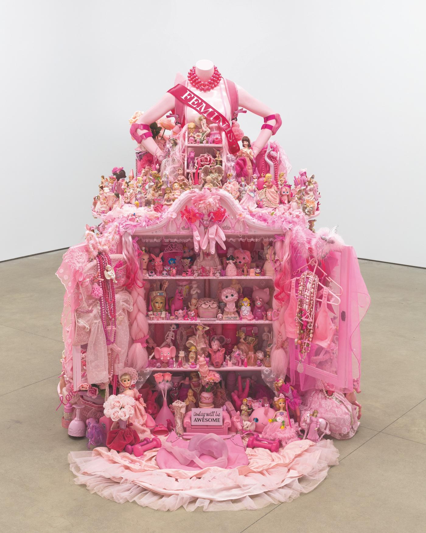 Portia Munson, Today Will Be Awesome, 2022. Found pink objects, pink synthetic fabric and cloths, mannequin, salvaged round bar table, and deconstructed secretary desk/cabinet, 72 × 60 × 70 in. (182.9 × 152.4 × 177.8 cm)