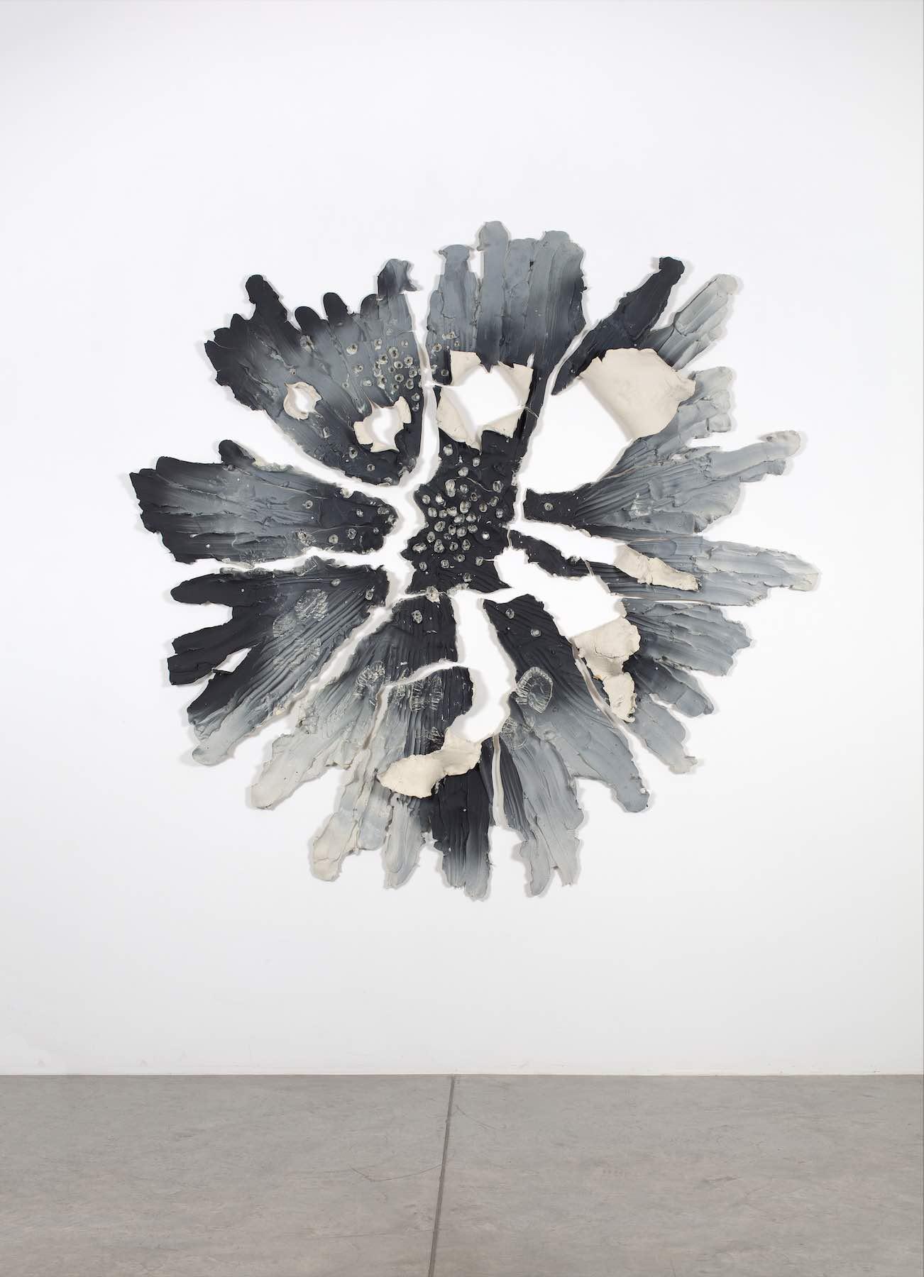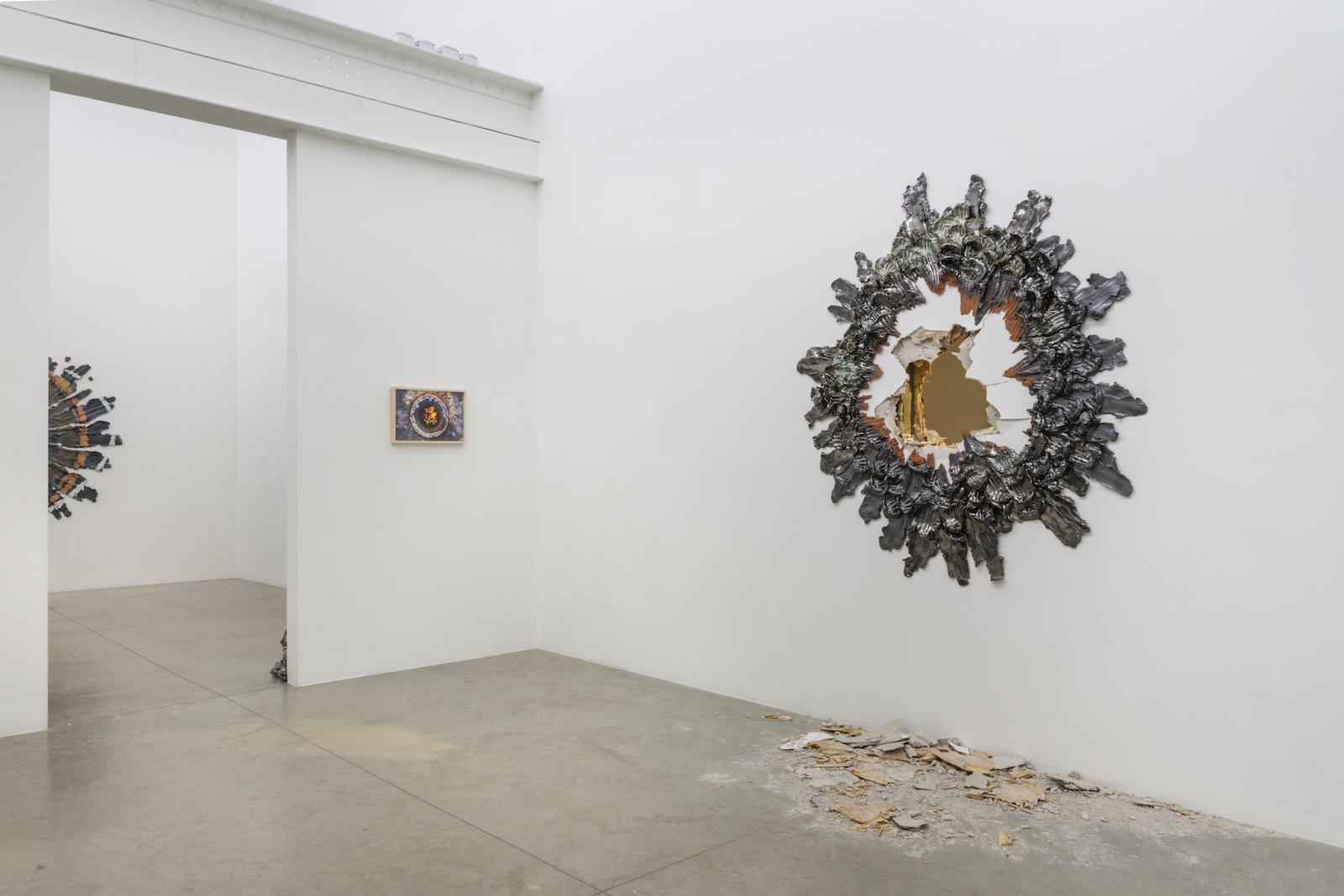 Last summer, working with ceramist Ralph Scala, she harvested raw clay from an ancestral Puebloan mine in the Galisteo Basin of New Mexico. The video of her performance there, Digging In, Digging Out (2021), which had just been on view at albertz benda gallery, allowed mesmerized viewers to feel they were collaborating over the course of its twelve minutes. They witnessed Ruais burrowing in to the sound of wind, the whirring of a drone, and her scraping of the clay. In the gallery, the video could also be viewed through a smashed hole in the wall of an adjacent gallery with debris scattered on the floor beneath it. On the opposite wall hung a circular construction Letting the Fire In (2021) composed of fragments of pit-fired stoneware and random bits.