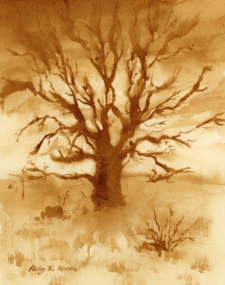 Hailey E. Herrera, Lone Tree. Folgers decaf coffee on paper.