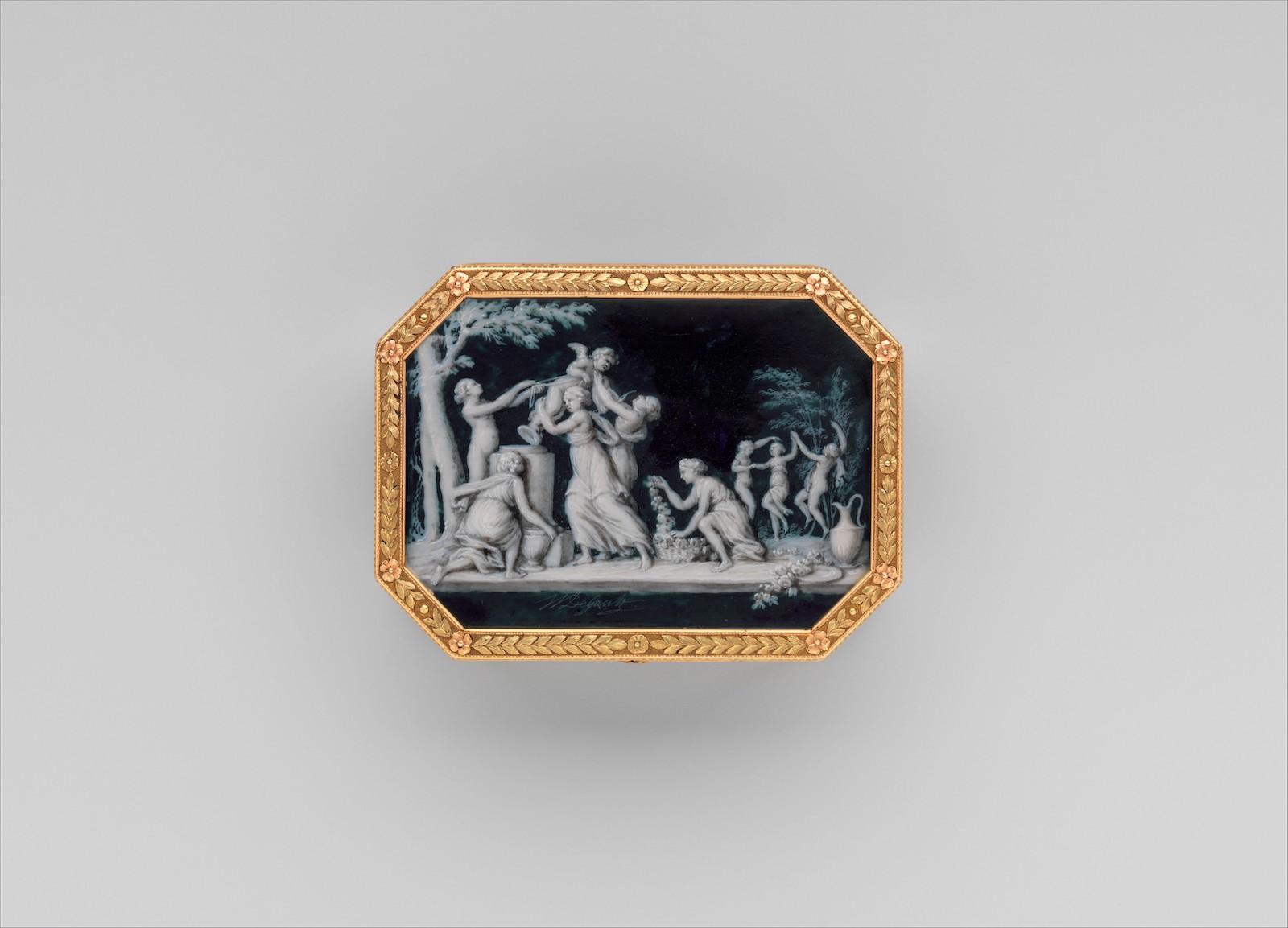 Miniatures by Jacques Joseph de Gault, Snuffbox with miniatures representing the Diversions of Love and dancing figure, miniatures ca. 1775, box ca. 1838–47. Gold; grisaille on enamel.