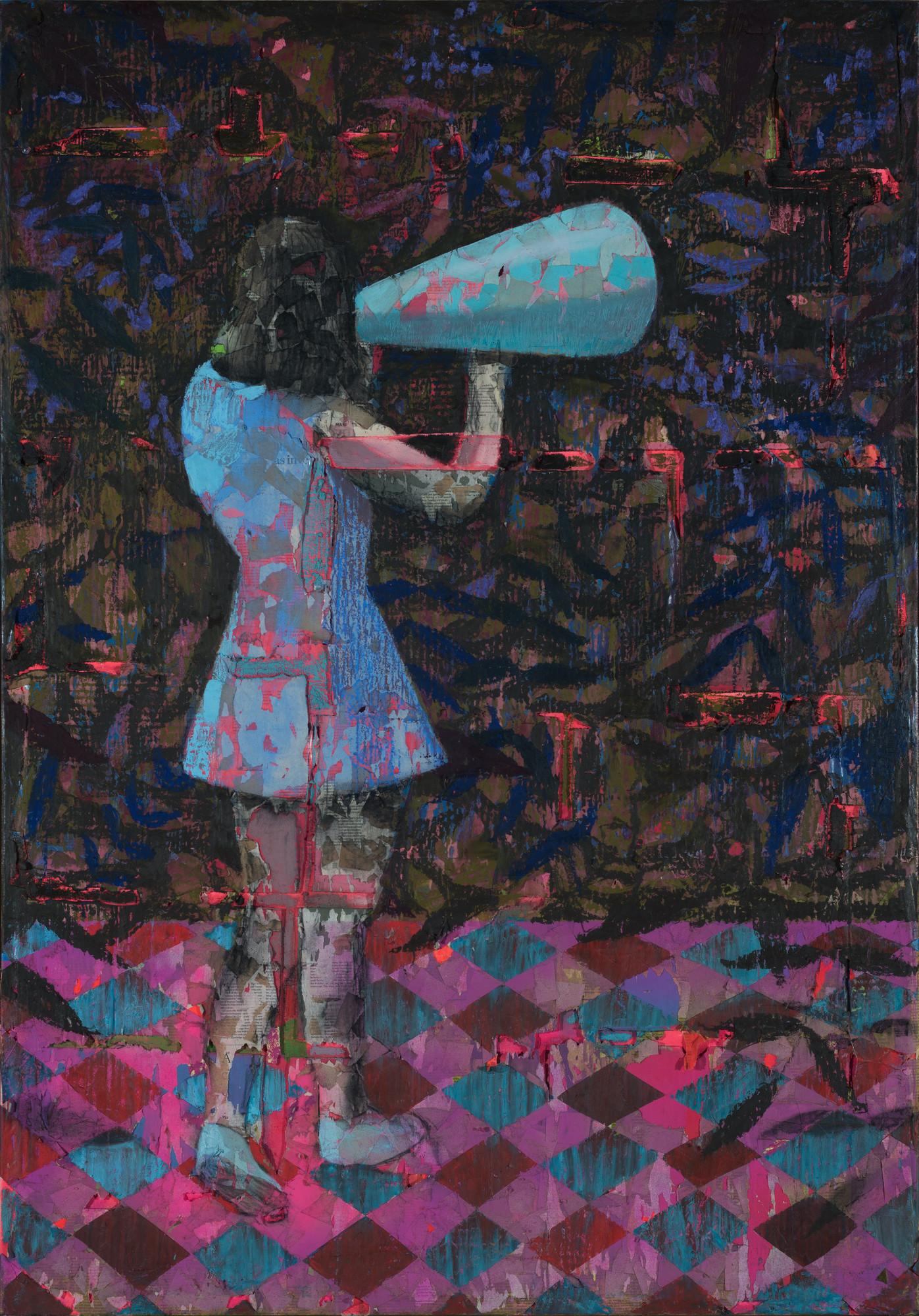 Derek Fordjour, Blue Horn, 2017. Oil pastel, charcoal, acrylic, cardboard, and carved newspaper mounted on canvas, 60 × 40 in. (152.4 × 101.6 cm).