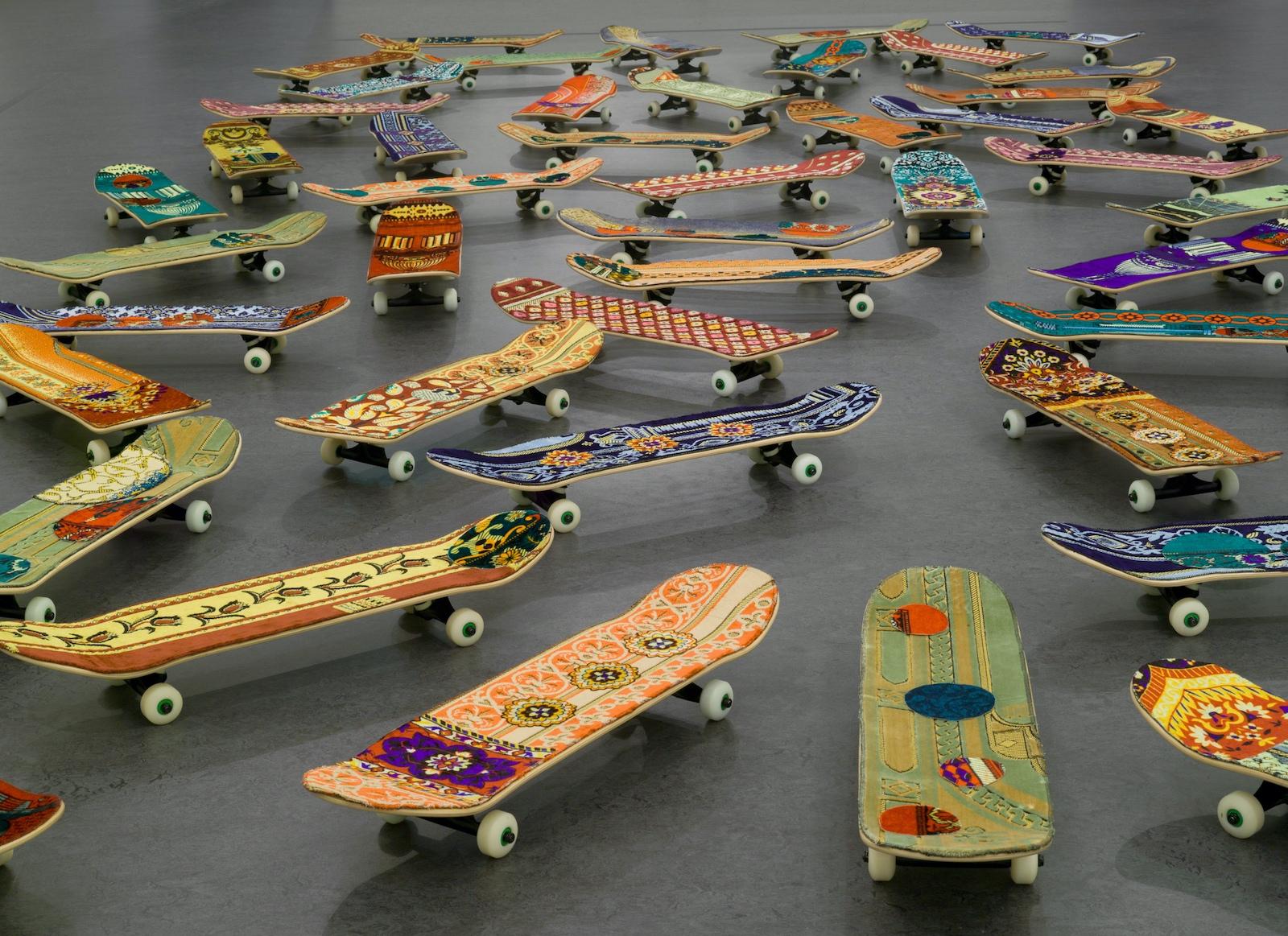 Mounir Fatmi, Maximum Sensation, 2010. Fifty skateboards, plastic, metal, textile, 5 × 8 × 31 11/16 in. (12.7 × 20.3 ×80.5 cm). Brooklyn Museum.
