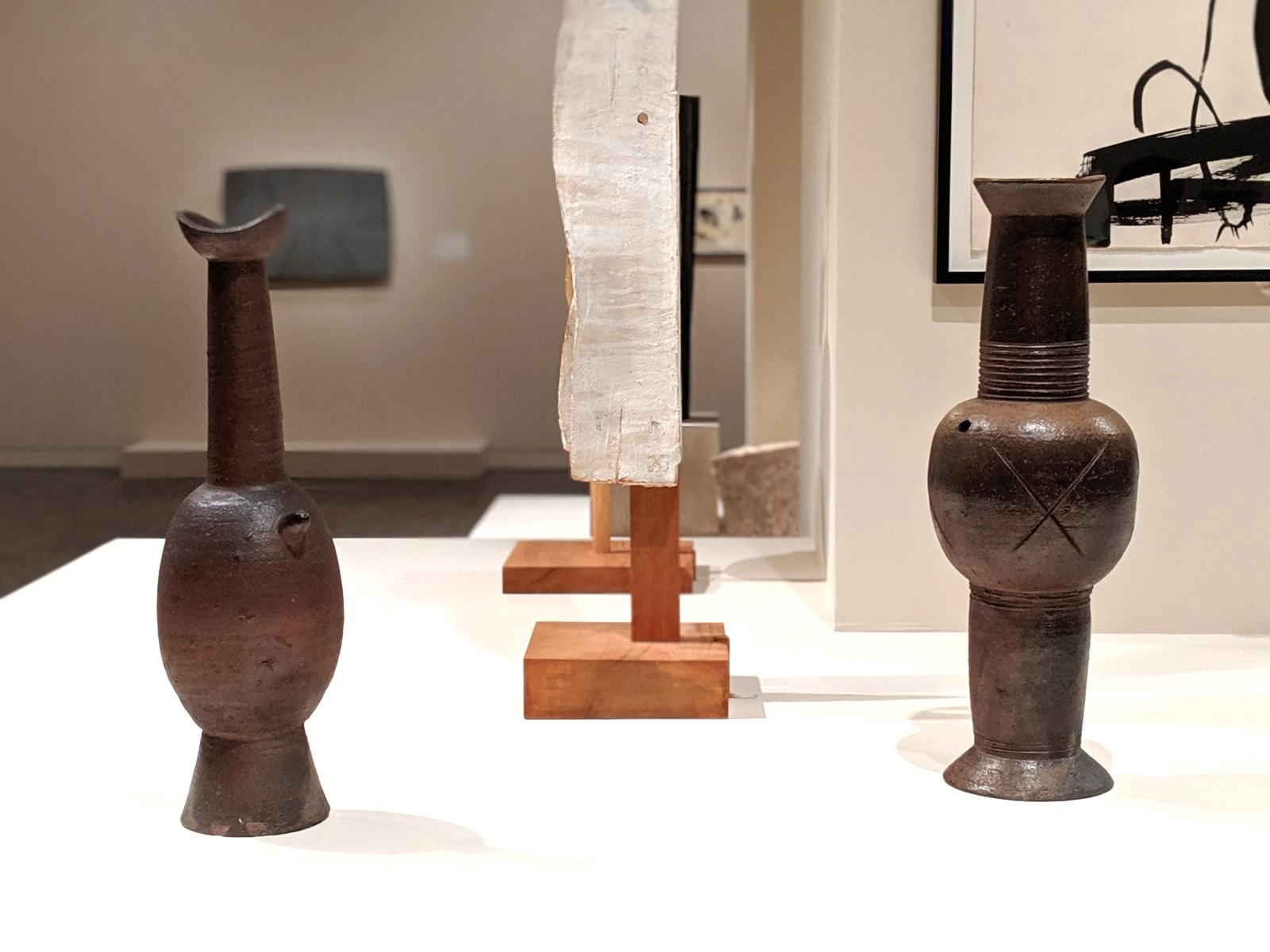 The strength of Noguchi and Hasegawa’s works, and of this exhibition, is simplicity. The essential, visible to the eye, emerges from Noguchi’s sculptures and Hasegawa’s calligraphies and drawings. This simplicity gives space to meaning and abstraction. For instance, Noguchi’s jars Man and Woman (1952) were created according to traditional Japanese craftmanship using Bizen stoneware clay and made by ceramists of the Kaneshige Toyo studio. These jars represent two abstract human forms while maintaining their practical purpose as vessels.