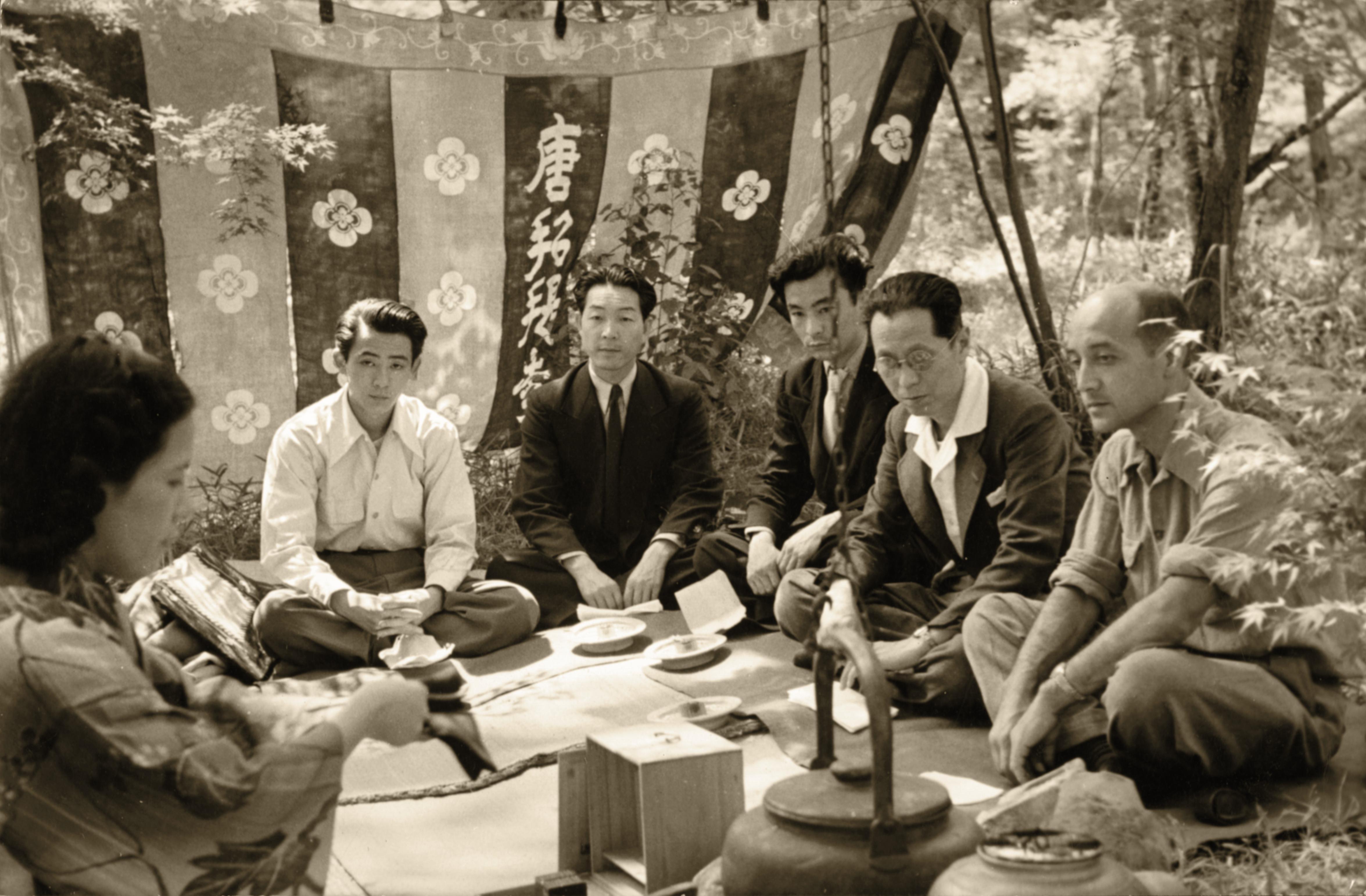 Isamu Noguchi in Nara with Saburo Hasegawa, Michio Noguchi, and other friends on his 1950 trip to Japan.