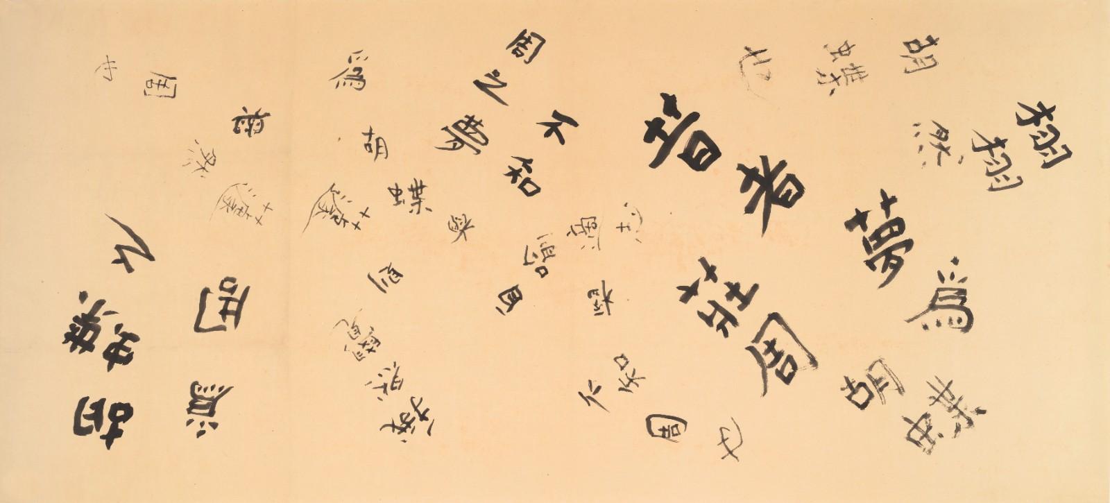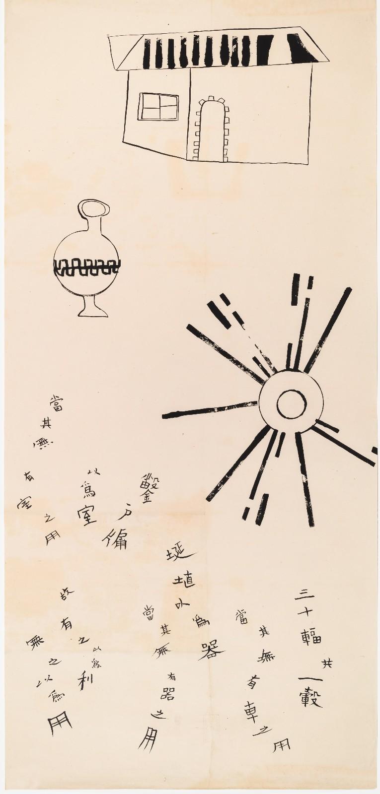 Hasegawa’s take on the same passage is a calligraphy piece with images of a vessel, a house, and a wheel. Even in this case, the empty space between the characters and the figures enhances and materialize the meaning of Laozi’s verses. In a similar way, Hasewaga transcribed and transformed a passage from another Chinese philosophical text, the Zhuangzi. His The Butterfly Dream (1956) is a calligraphic exercise based on the verses: “Once upon a time, I, Zhuangzi, dreamed I was a butterfly [...] Did Zhuangzi dream he was a butterfly, or did the butterfly dream he was Zhuangzi?” The characters on the paper resemble the flight of butterflies, purposeful and ethereal, as well as the fragility and endurance of the human mind.