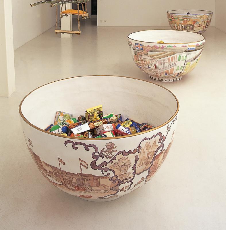 Huang’s Da Xian: The Doomsday consists of three large porcelain bowls decorated with the flags of the Western powers that colonized China in the nineteenth century. Inside the bowls, Huang placed British packaged foods that shared the same expiration date “Best Before 1 July, 1997,” the date of Hong Kong’s handover to China. While The Doomsday can be read as a critique of capitalism, consumerism, and colonization brought by Western powers, it can also be seen as a reminder that Chinese people have always been resilient. Life can be seen as a full bowl, even in adverse times.