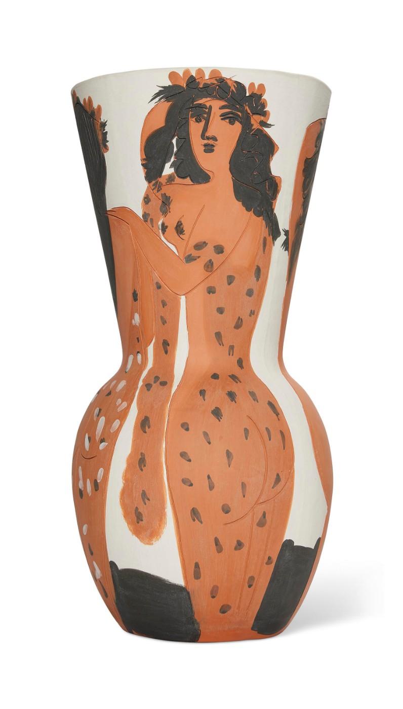 The highest selling lot of the auction was a 1950 Picasso vase, Grand vase aux femmes voilées (Large vase with veiled women). Part of an edition of 25, the vase features a frieze of nude women, the curve of their figures accented by the dramatic shape of the vase itself.