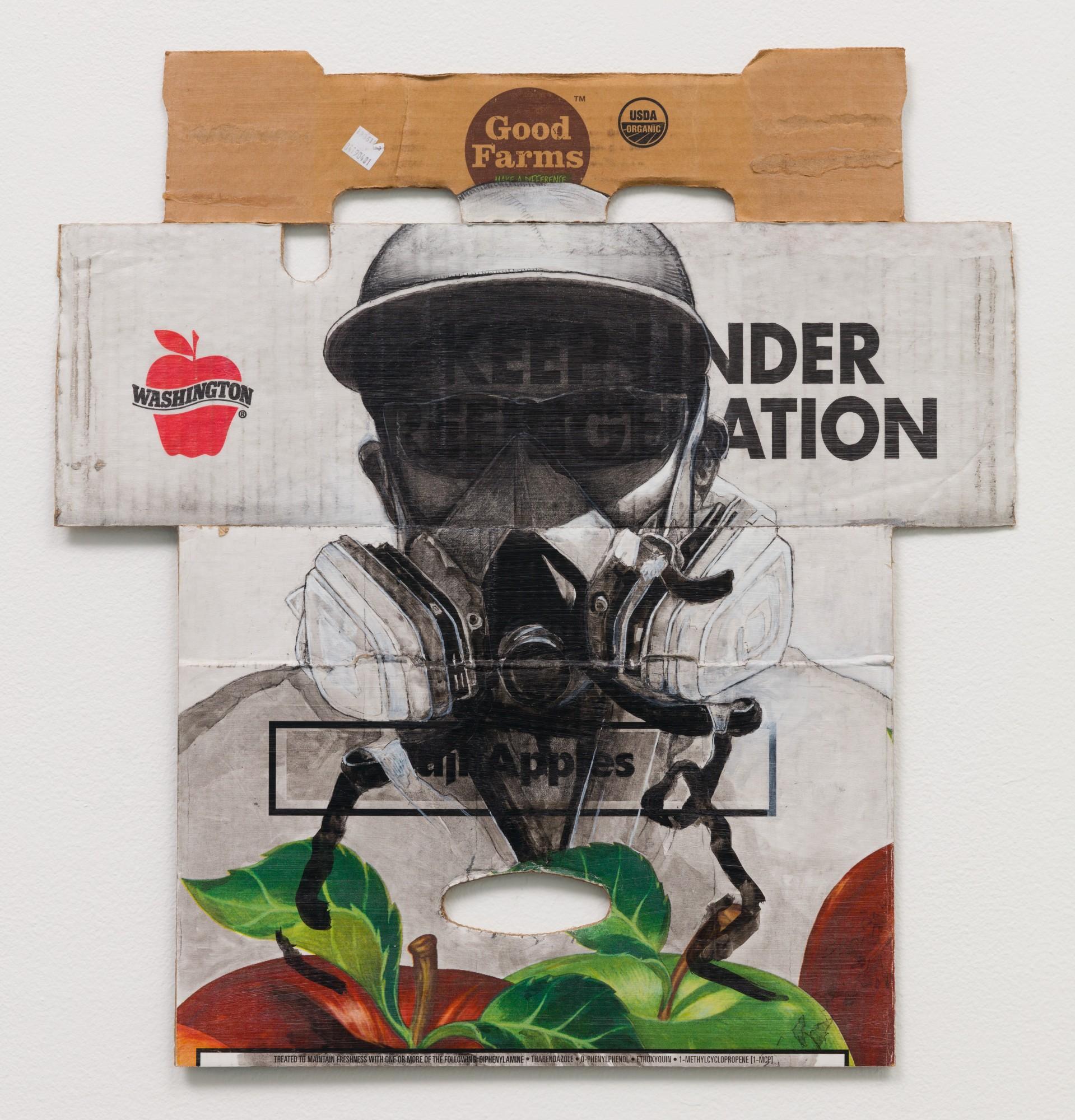 Anderson’s allegorical paintings and ceramic sculptures, priced between $5,000 and $12,000, address issues of race using such pop culture references as emoji and aesthetic styles historically related to western imperial power in his highly coveted works. Levitt, whose works range in price from $1,000 to $8,500, creates enticing still life canvases that toy with the idea of painting in surprisingly surreal and conceptual ways. And Martinez’s desirable realistic drawings of farmworkers on cardboard produce boxes, priced between $2,800 and $15,000, eloquently commemorate agricultural labor and the migrant experience.