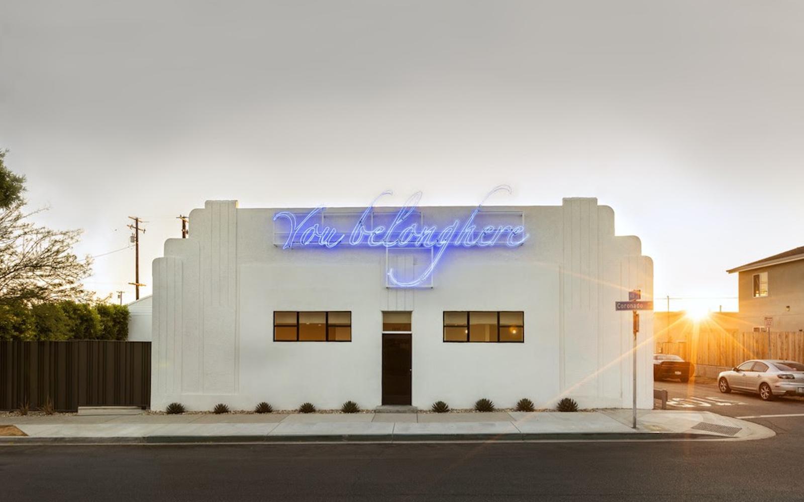 Lauri Firstenberg, who founded the nonprofit LAXART in 2005, is among those who have lent expertise to the project coming on board as artistic director to oversee curatorial decisions. All of Compound’s programs are infused with a Policy of Belonging. To make no mistake about it, You Belong Here, a blue neon work by Getty artist in residence Tavares Strachan is mounted on the façade, over the front entrance of Compound declaring that this space is a welcoming place for all who choose to enter.