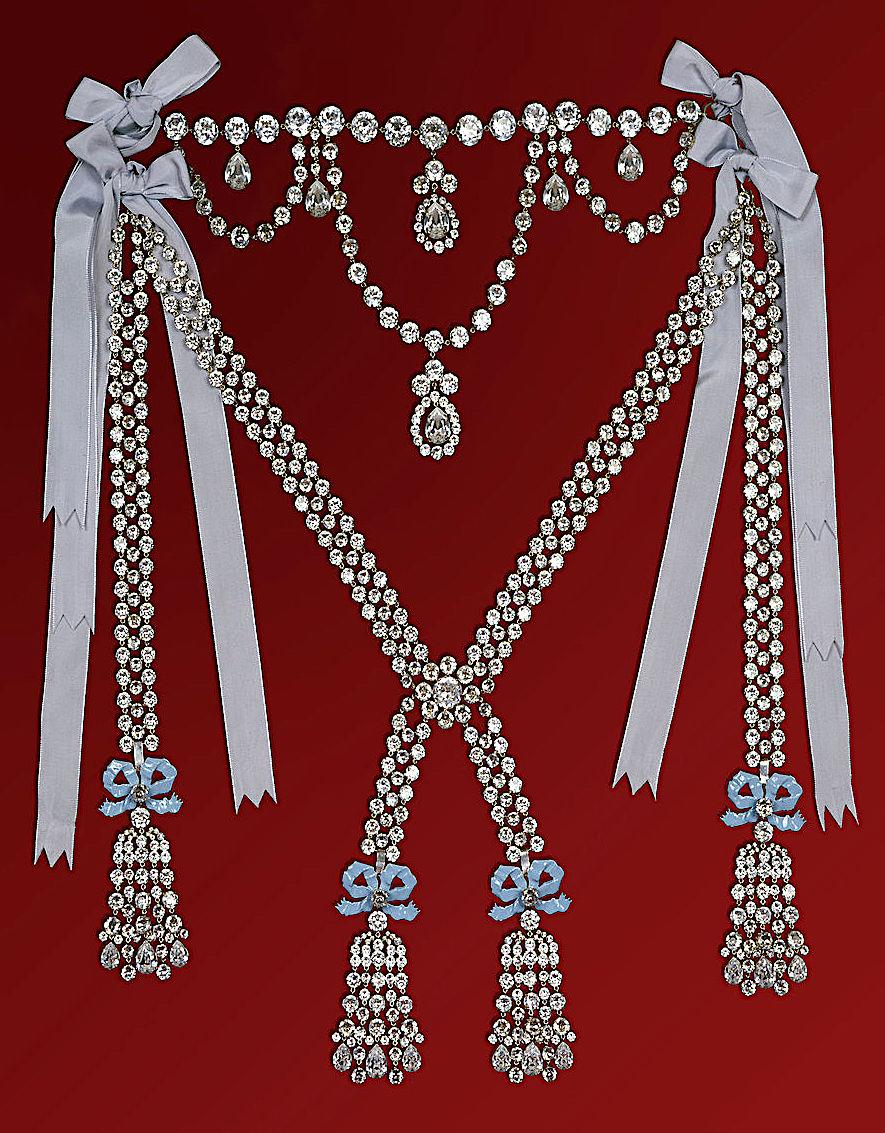 The necklace, in its current state, consisting of two diamond tassels that can either be worn open or tied together like a scarf, is a far departure from the 650-diamond titanic that King Louis XV once commissioned as a gift for his mistress, Madame du Barry, in 1772.