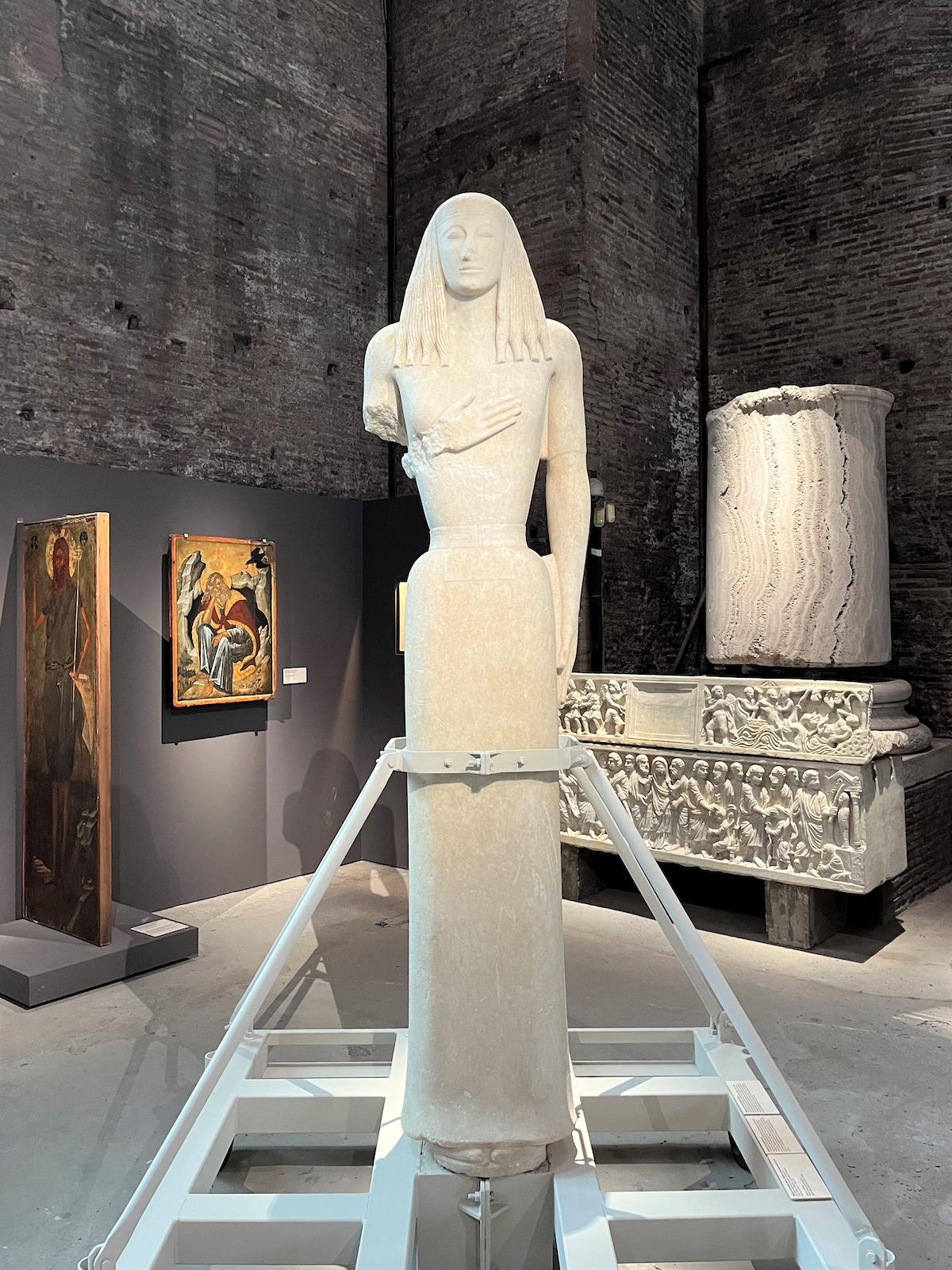 The assemblage of objects is of the highest quality. There are exceptional marble statues and portrait busts not only from Italy but also from the islands of Delos and Santorini. From the latter, too, is an extraordinary, two and a half meter tall, archaic ‘Kore’ (female statue), which was discovered in 2000 but remained in storage until last year. There is a fourth-century BC gold ‘orphic tablet’ inscribed with an incantation to be read at the entrance to Hades, and a collection of precious silverware including the bust of the co-emperor Lucius Verus.