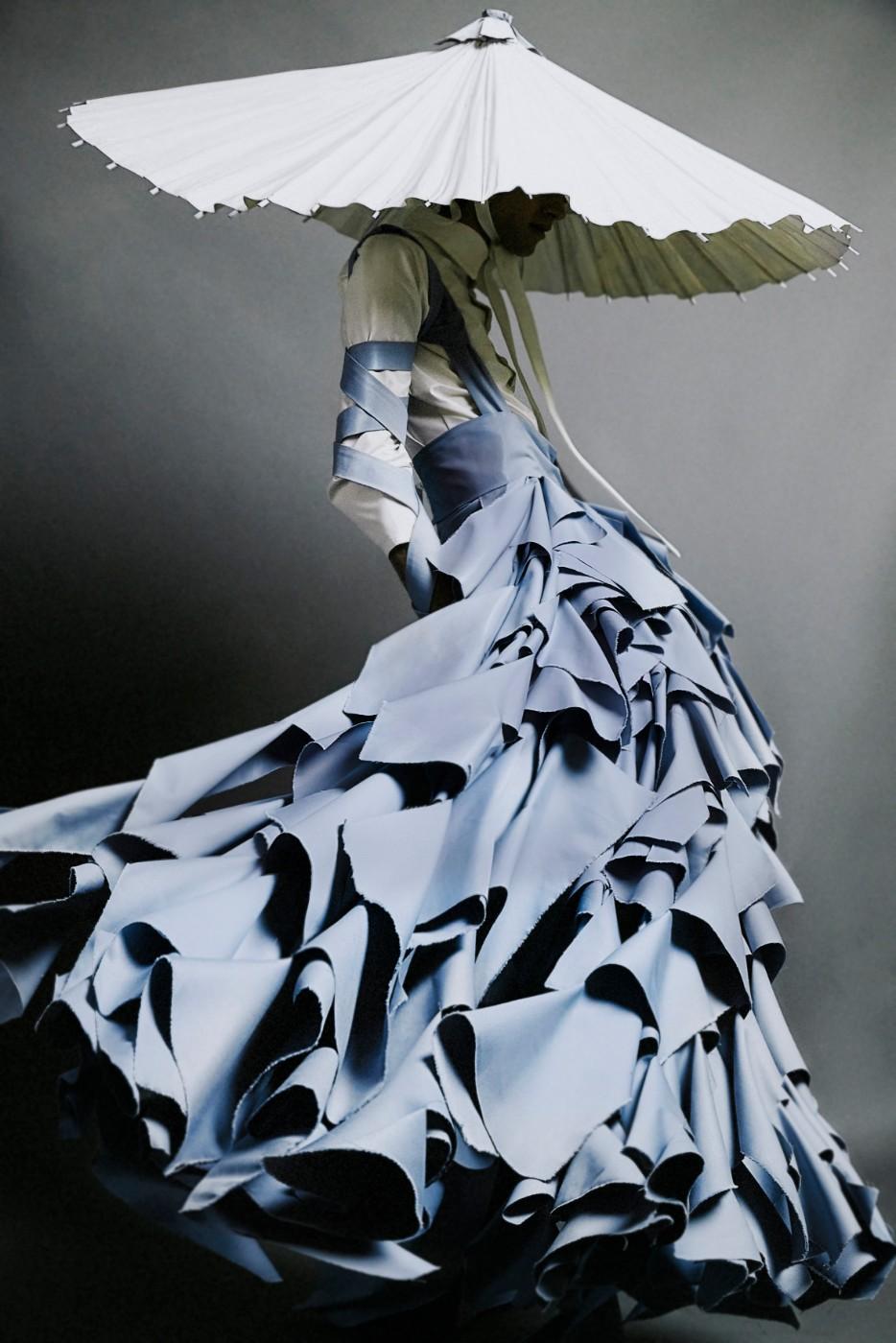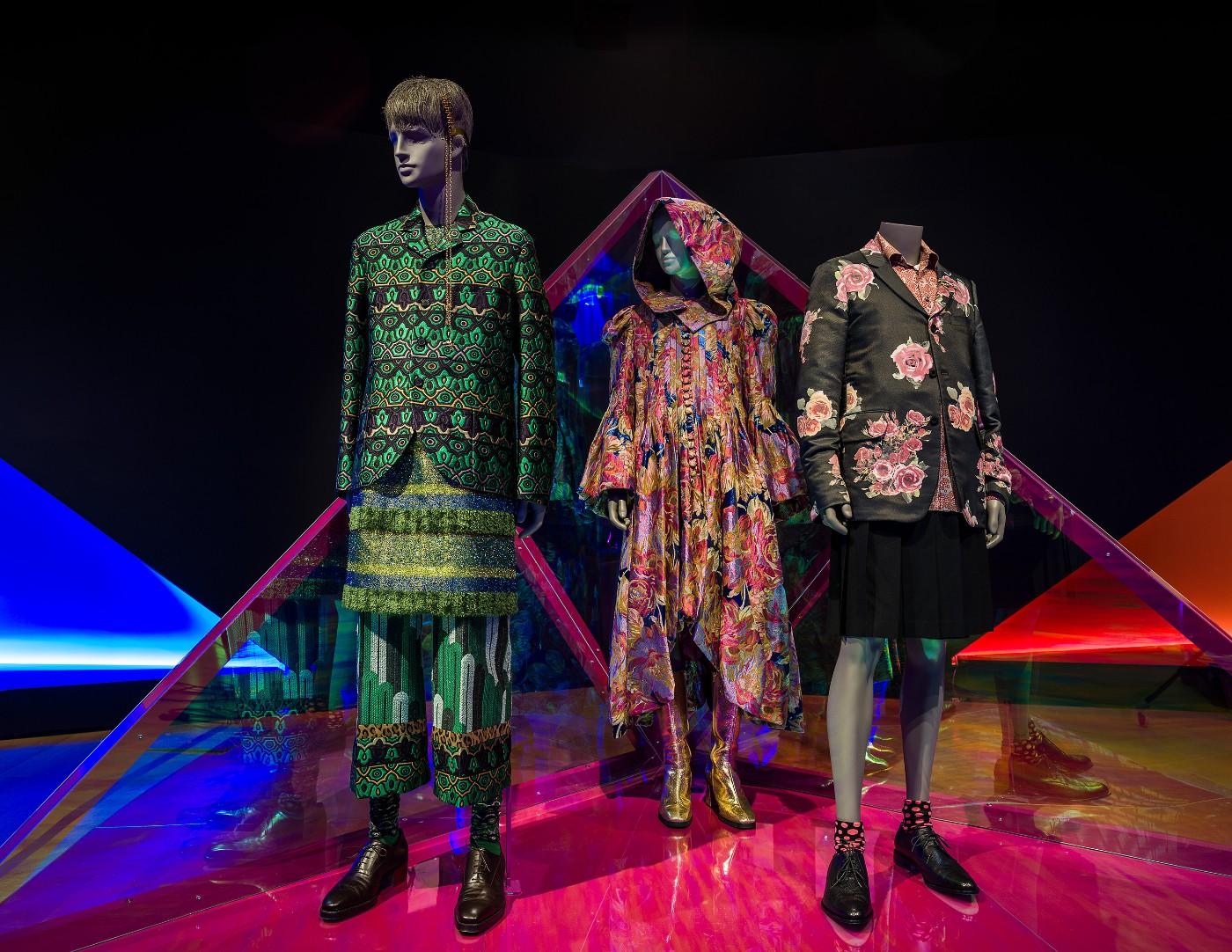 A magnificent dress by Italian designer Alessandro Trincone is the signature image for the exhibition (shown above). The elegant, cascading skirt of grey ruffles topped with a parasol-like headpiece shadowing the wearers face and therefore their identity could proudly be worn by a woman but was designed for a man. It was worn by the rapper Young Thug (a.k.a. Jeffery Lamar Williams) on the cover of his 2016 album No, My Name is JEFFERY. The outfit has a Samurai-inspired feel, giving license to skirt wearing warriors past and present.