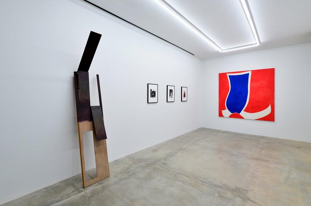 Installation view of Parergon: Japanese Art of the 1980s and 1990s, including Kazumi Nakamura's KAIKOMA I, (1979, left) and Yukie Ishikawa's Red Brothers (1995, right)