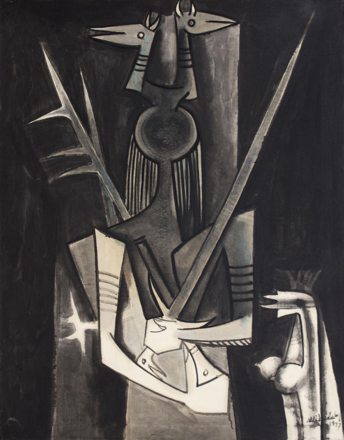 Le Guerrier I belongs to a body of work where the artist explored the relations between the metaphysical world and our own. The two-birds-headed armed warrior painted in flat, planar geometrical shapes against a rich dark background evokes the need for independence and autonomy, rejecting any form of predetermination to create a uniquely poetic and magic universe with undeniable power. Refuting color, Lam restricted his palette to shades of brown, black, and gray in conjunction with white. The suppression of color allowed him to display his extraordinary skills as a draftsman.