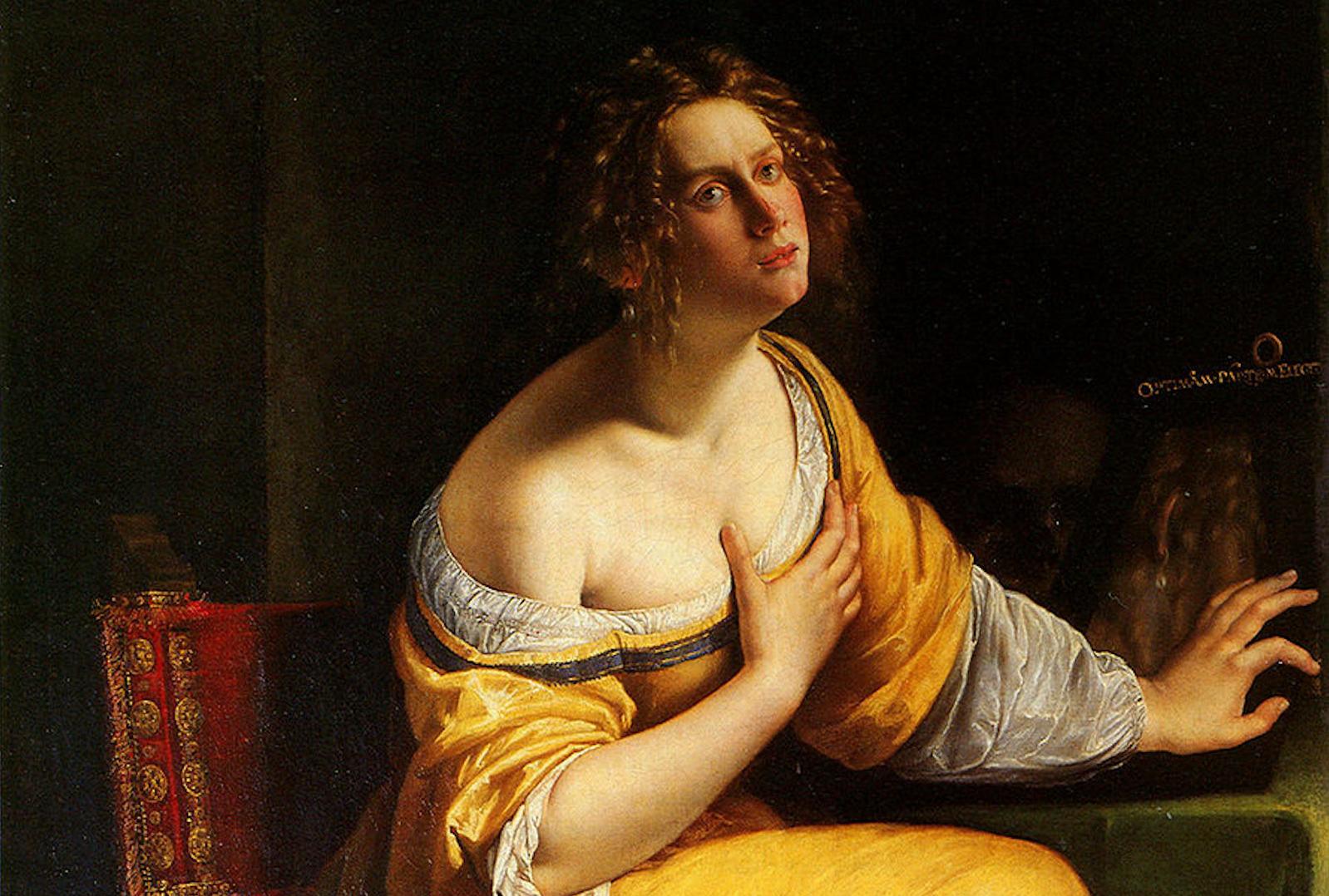 Artemisia Gentileschi, Conversion of the Magdalene/Penitent Mary Magdalene, (detail of) 1620. Oil on canvas, 57.6 x 42.5 in. (146.5 x 108 cm.), Pitti Palace, Uffizi Galleries, Florence.