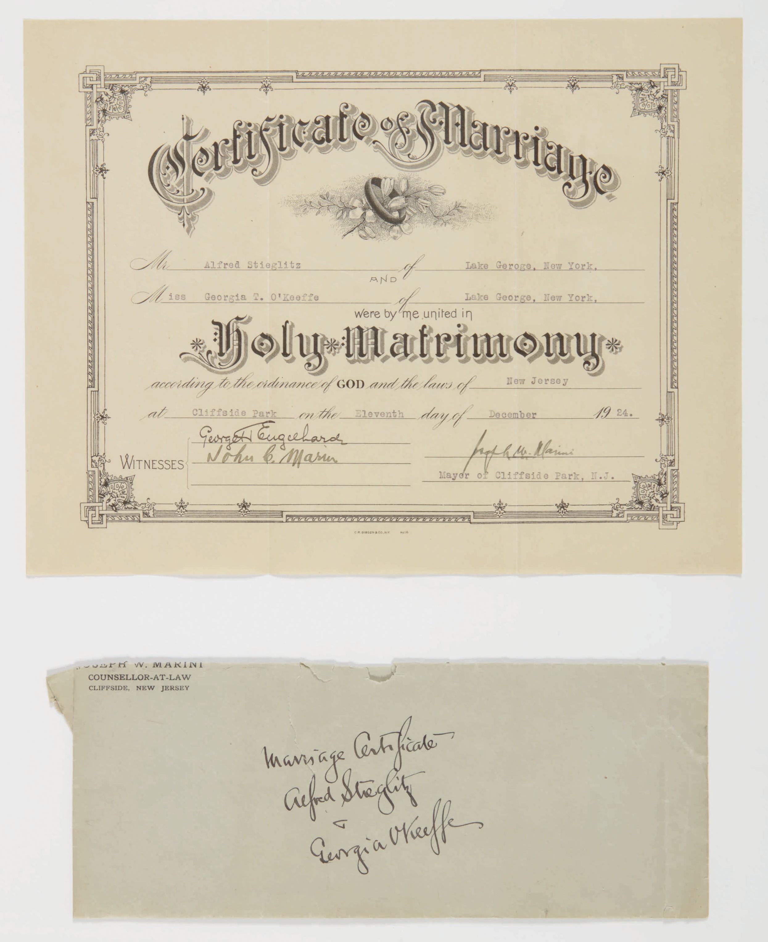 Georgia O’Keeffe and Alfred Stieglitz’s marriage certificate is estimated to reach $7,000-10,000.