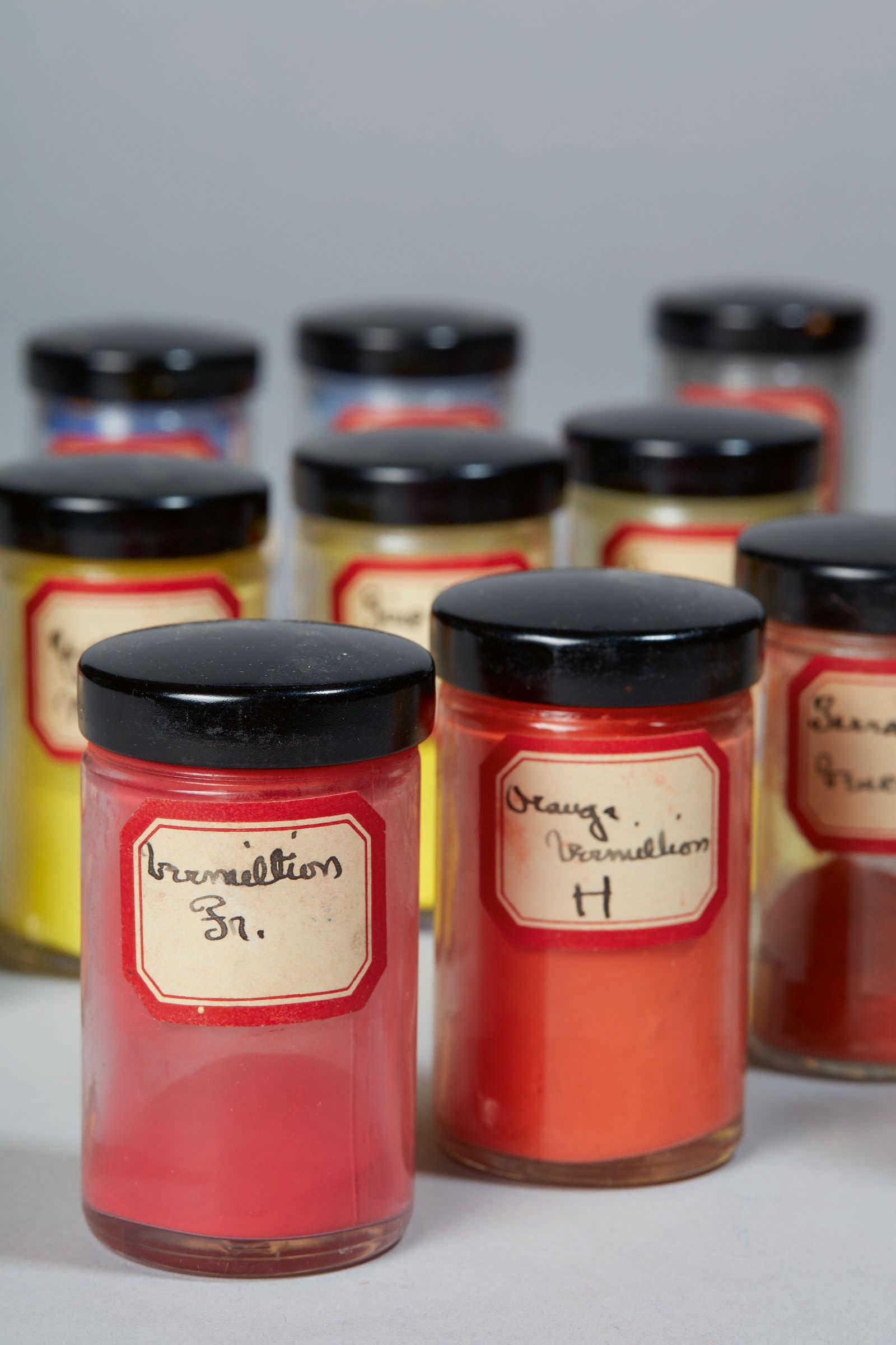 A grouping of eighteen jars of pigment, each affixed with an adhesive label with the color of the pigment written in O’Keeffe’s hand, is one of the more personal lots on offer. It is estimated at $15,000-20,000.