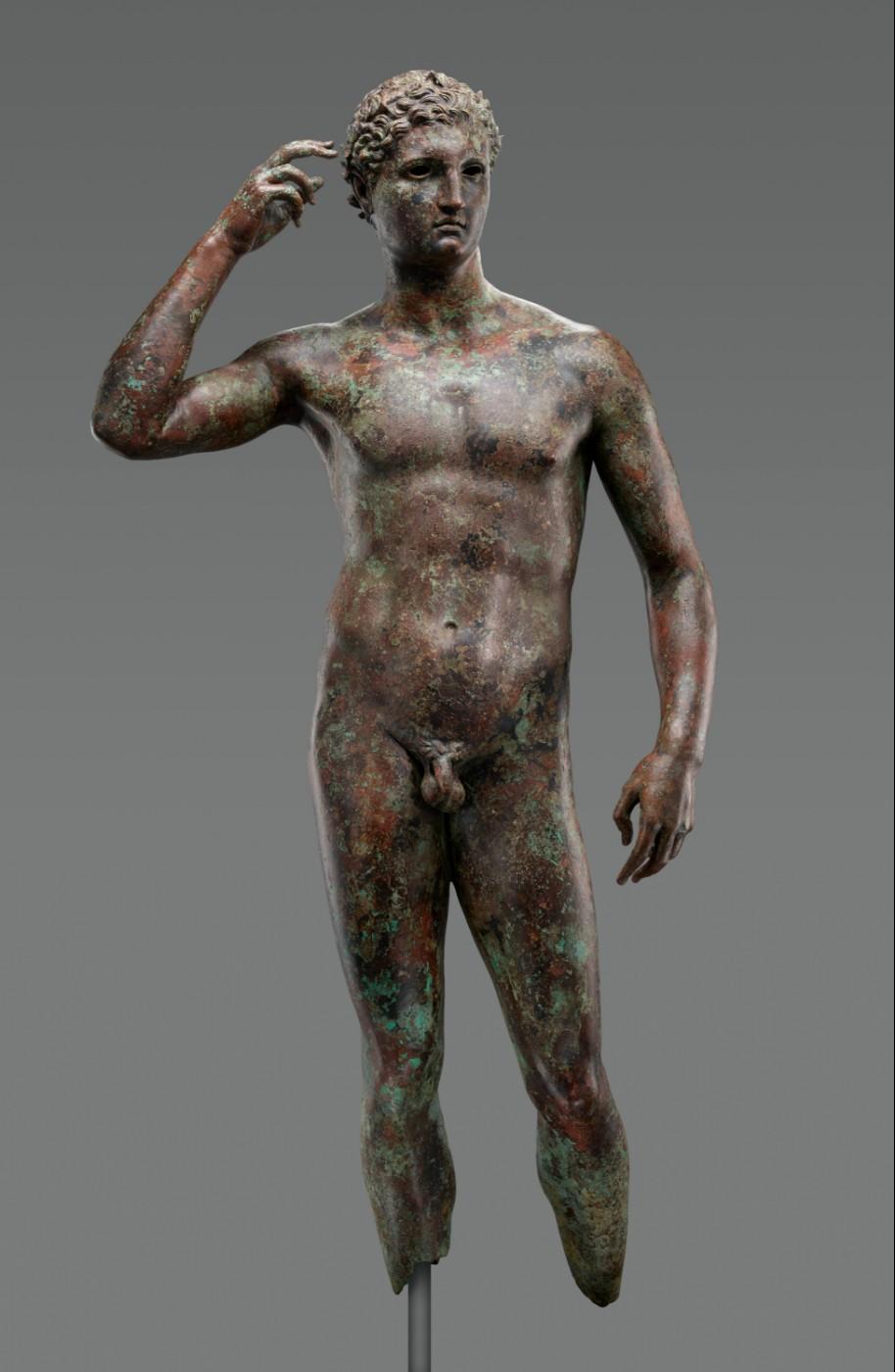 Italian fishermen hauled it aboard in their nets, encrusted in layers of barnacles and mineral deposits, and hastily sold it to local dealers, illegally flying under the radar of Italian authorities on cultural patrimony. Preserved by the sea for millennia, the statue is one of the few life-size Greek bronzes to have survived antiquity. A crucial example of the Greek mastery of the cast-bronze technique, the work is inlaid with copper and would have originally had stone or glass inlay details.
