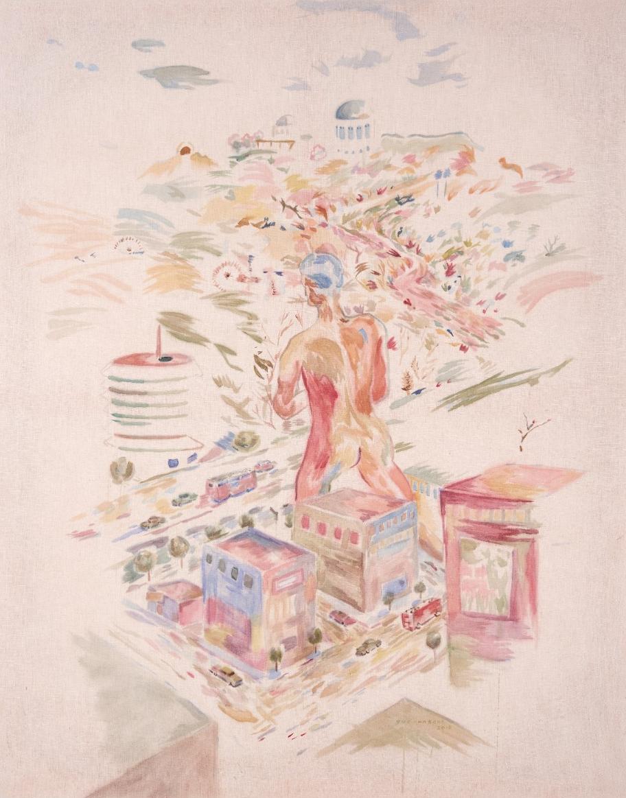 Splashes of vivid color and pale pastels characterize this series of mostly abstract male nudes blending with impressionist cityscapes of Hollywood and L.A. In Untitled (Hollywood 4) a naked colossus stalks Hollywood Boulevard, towering above the Capitol Building. In Untitled (Hollywood 16), a nude kneels beside a parked car. Another crouches on a hilltop overlooking an impressionistic valley, the Observatory in the distance.