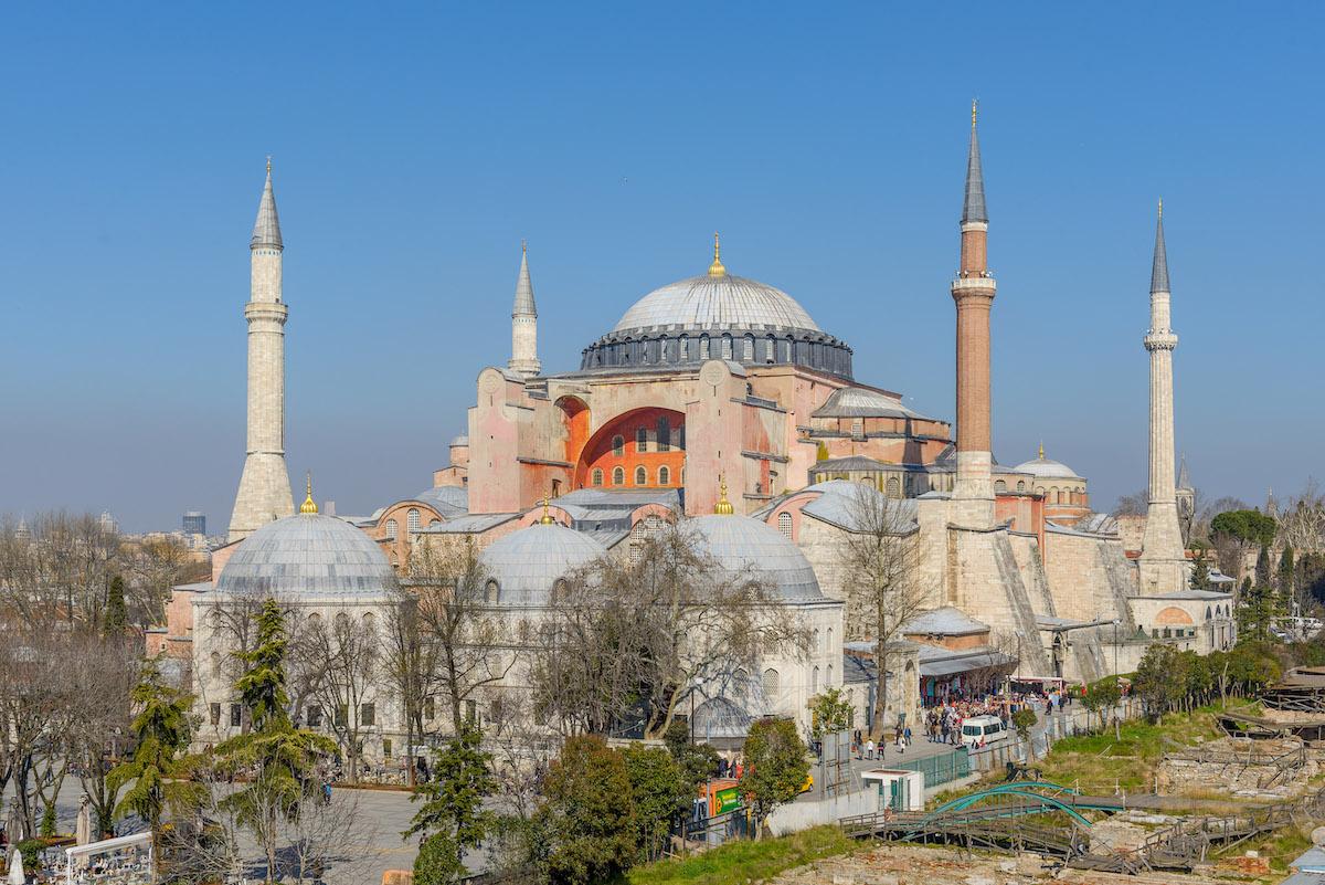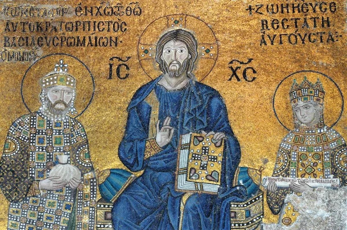 One obvious instance of this apotheosis is the mosaic panel’s depiction of the Empress Zoë and her husband Constantine IX Monomachos (1000 to 1055 CE) flanking Jesus Christ. Manmade, over-embellished loros costumes and headpieces attempt to mimic Christ’s effortless power, juxtaposed with a simple, bold blue chiton and nimbus. Yet the image unites divinity with human politics and summarizes Constantinople’s ecumenical zeitgeist.