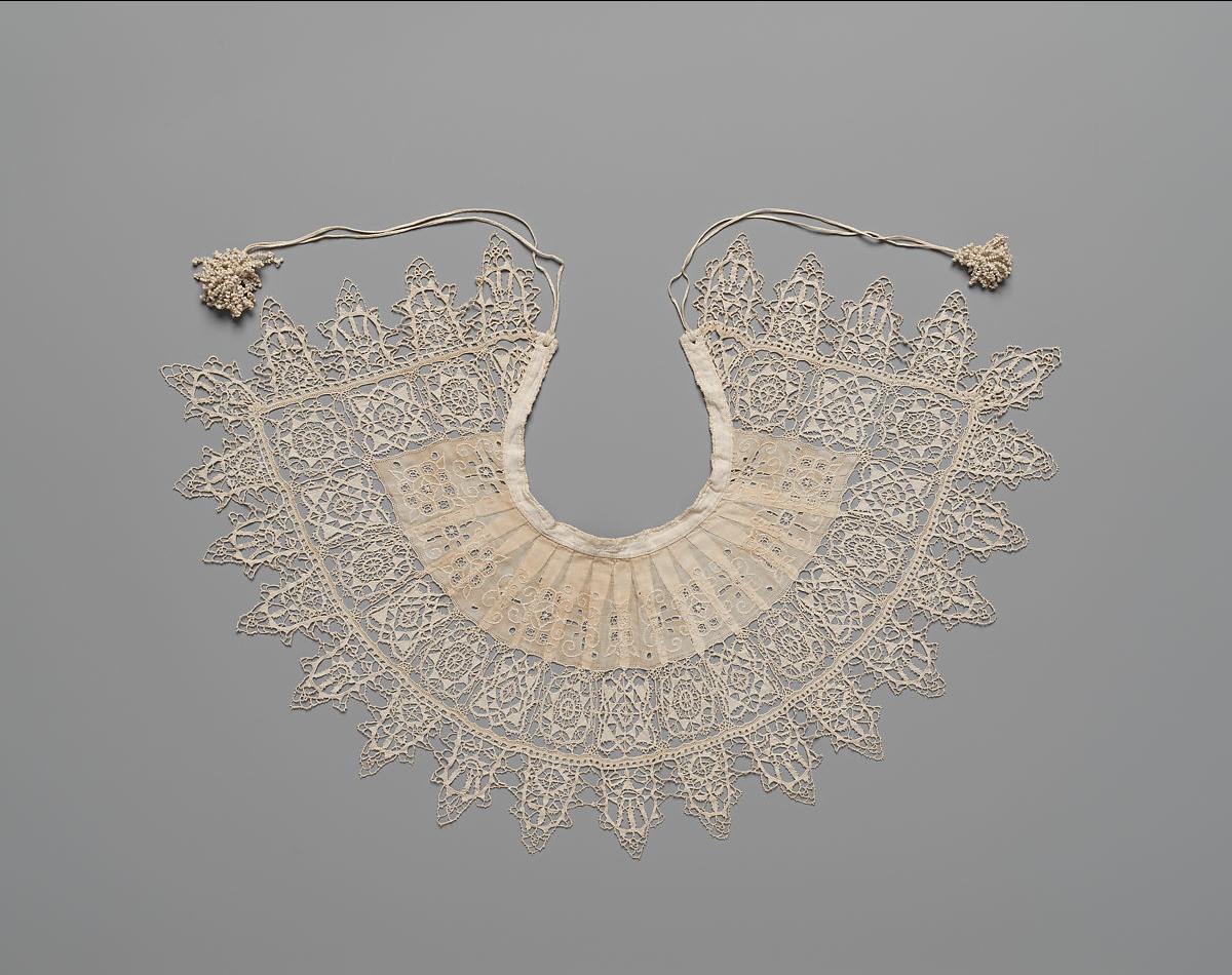 While there is no academic consensus on when lace was invented, the practice is believed to have emerged in the fifteenth century. It is considered uniquely European, finding roots in Italian tradition. Some of the earliest references can be found in funerary inventories and dowries, while visual evidence was established in paintings such as Hans Memling’s Madonna and Child with St. James and St. Dominic.