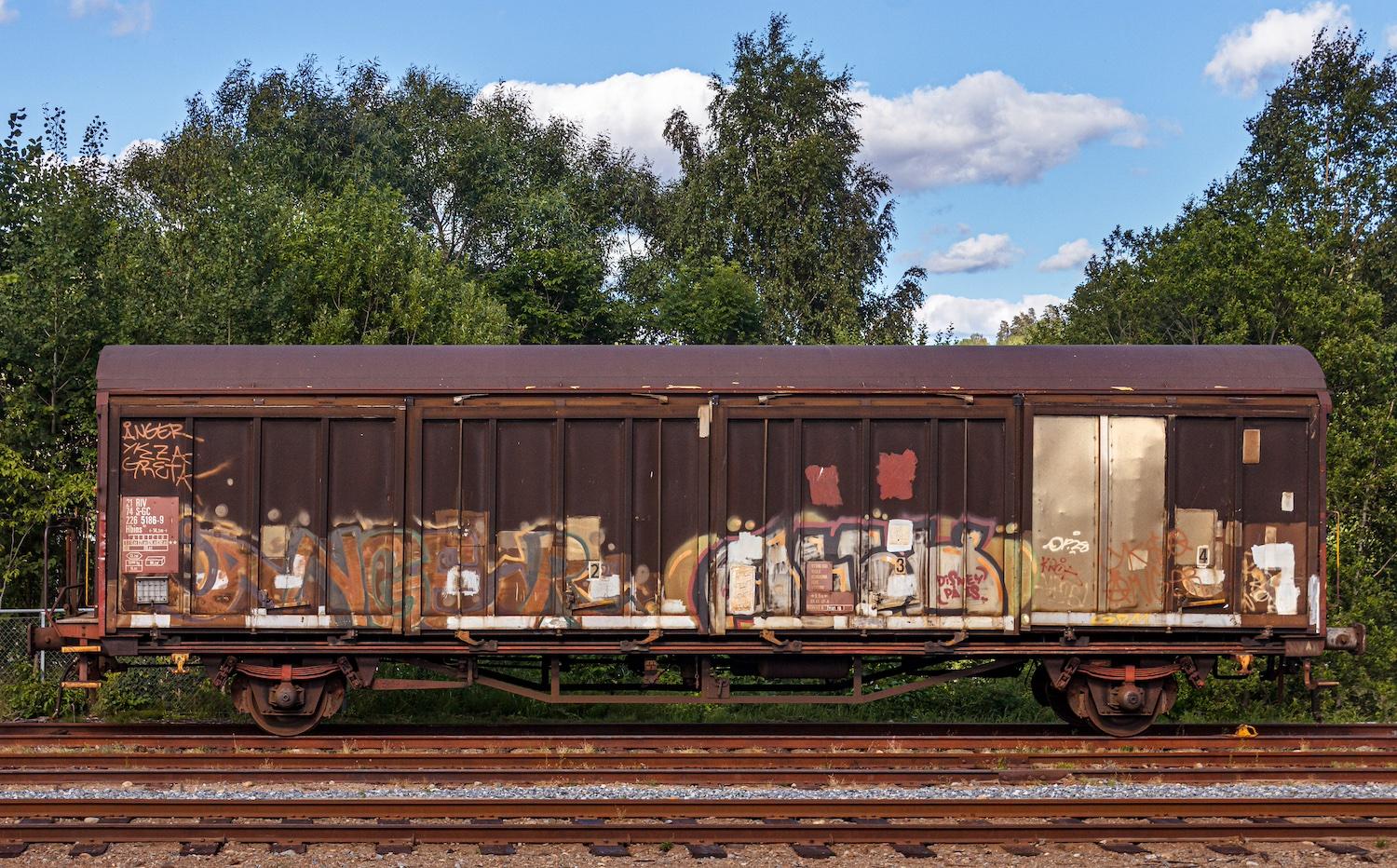 Old, rusty freight wagon with graffiti at the Munkedal train station, Munkedal, Sweden. 2022. License