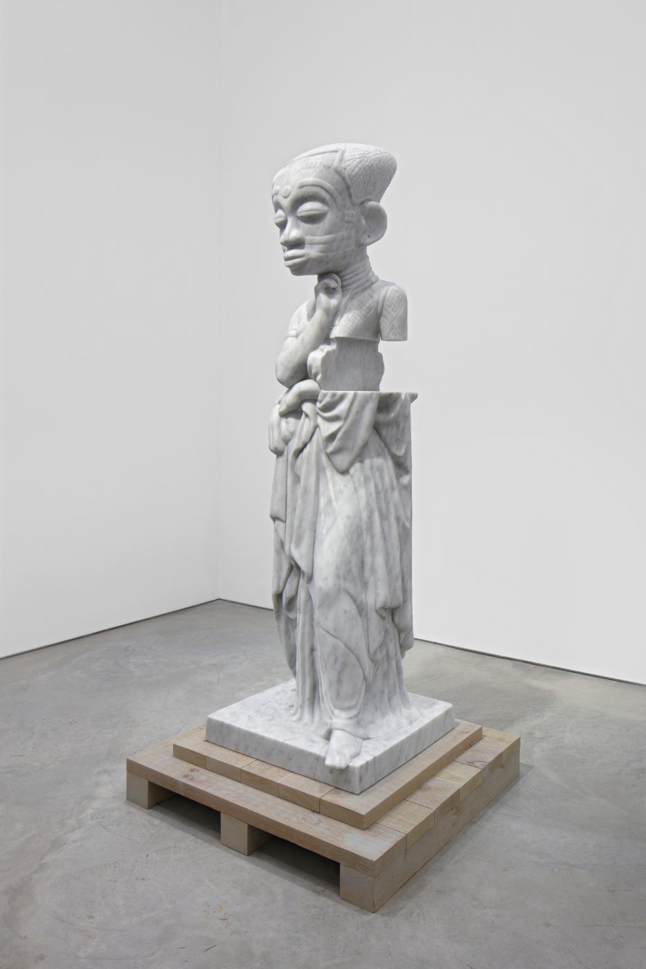 SB: This started as a dialogue between cultures and with my thoughts about sculpture in general—about how I was taught sculpture and how sculpture has been taught in the academy, with all of the weight and gravity and sacredness that we project onto quote/unquote monochromatic marble sculptures, and what they represent in the Western world. The reality is that lots of these historical sculptures were not monochromatic at all, rather they were painted. They had painted eyes or clothes or adornments that had worn off over time. As monochromatic pieces, however, they began to be used as propaganda for the purity and skill and genius of the Greco-Roman Empire, particularly because of the whiteness of the marble. When you study marble sculptures in Rome, you discover all of the different colors that were used on pieces to represent foreigners and invaders. The reason there are so many white marble statues, ironically enough, is that it was the cheapest material. The colored pieces that represent the foreigners were actually more exotic and expensive to produce, which is why you don’t see as many of them. African sculpture—to me—is equally as important—if not more—to look at, but I’ve never seen these types of pieces in marble. What would happen if I remade these pieces in marble? What would it look like? I’ve seen it in gold and I’ve seen it in wood, so what would it be like in marble? That’s how it started. I’m blending the European and the African, but even the African is blended in my sculptures, such as combining two different masks superimposed on each other. It’s all about cross-pollination.