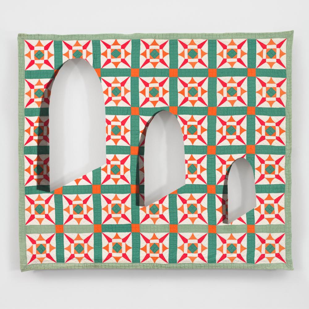 SB: At the end of 2019, or maybe as early as 2018. I had been thinking about the removal of material for some time, even while I was still in the additive stage of my process. It came about in Rome, when I was an artist-in-residence for a year at the American Academy after receiving the Rome Prize. There was one piece in Rome, where I made a three-dimensional quilt and then made a two-dimensional quilt piece out of the remnants with voids in it. It came out of thinking of the ruins of Rome and the degradation of material, of how it rips apart. I was thinking about the fall of the empire and deterioration of culture and material. When we get to 2019, I did two pieces—one with two columns that are cut out and draped on the floor and one that has these illusionary shapes that were cut out to create drop shadows. That’s when it really started to crystalize, and I wanted to capitalize on it.