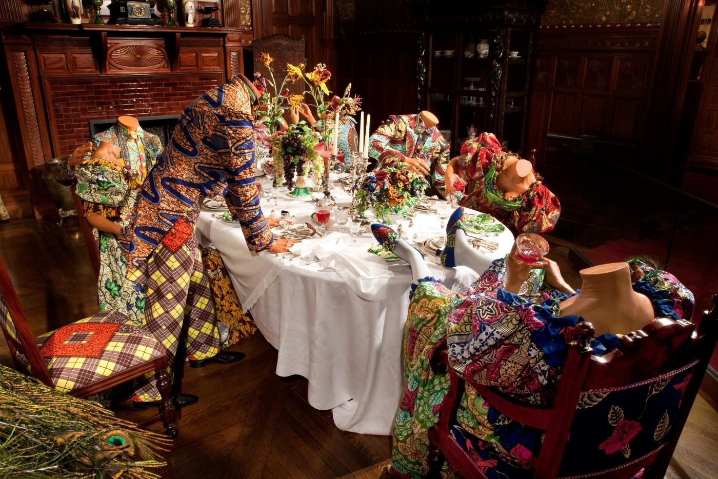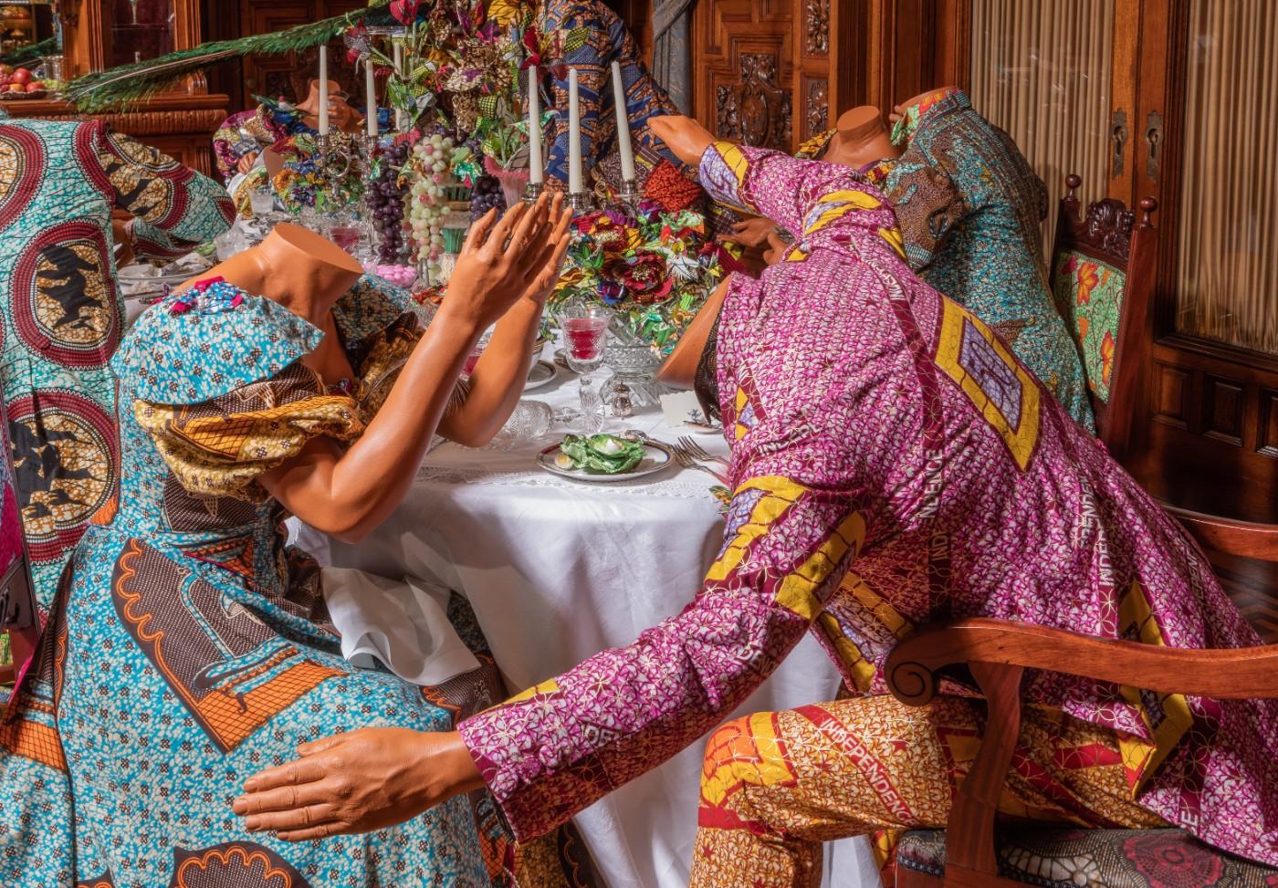Each anonymous figure is not only headless—alluding to guillotined aristocrats of the French Revolution—but wears Victorian-style clothing in a signature textile in Shinobare’s work: batik fabric that has a convoluted history of reappropriation rooted in Dutch colonization. During the 19th-century, these patterned cloths known as Dutch wax fabrics were initially manufactured in the Netherlands and brought to Indonesia before they were sold in colonial African markets. Over time, they became global commodities and markers of African identity.