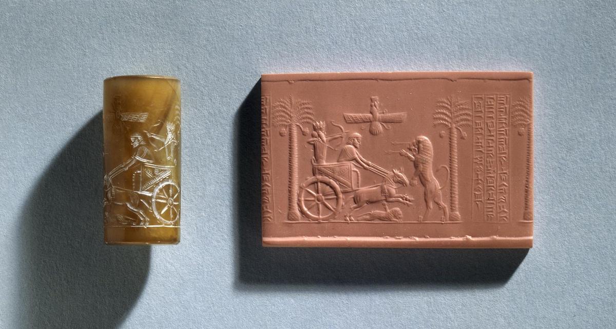Such clues and recurrences have become an essential part of Zoroastrian investigation; The Darius Seal displays its king at hunt, torso turned defiantly toward his viewer, as Darius repeatedly shoots a muscular lion, while his horses trample another. His clearly carved dentate diadem identifies the emperor, while a centered Ahura Mazda shines above, blessing the king’s conquest and dominating the scene. Yet the cylinder remains a debatable Zoroastrian object. While Cyrus the Great, founder of the Achaemenid empire and predecessor of Darius I, was a staunch Zoroastrian, Darius’ faith is uncertain. Only his religious tolerance is established, potentially turning the cylinder into an ode to religious unity, instead of a celebration of Zoroastrianism.