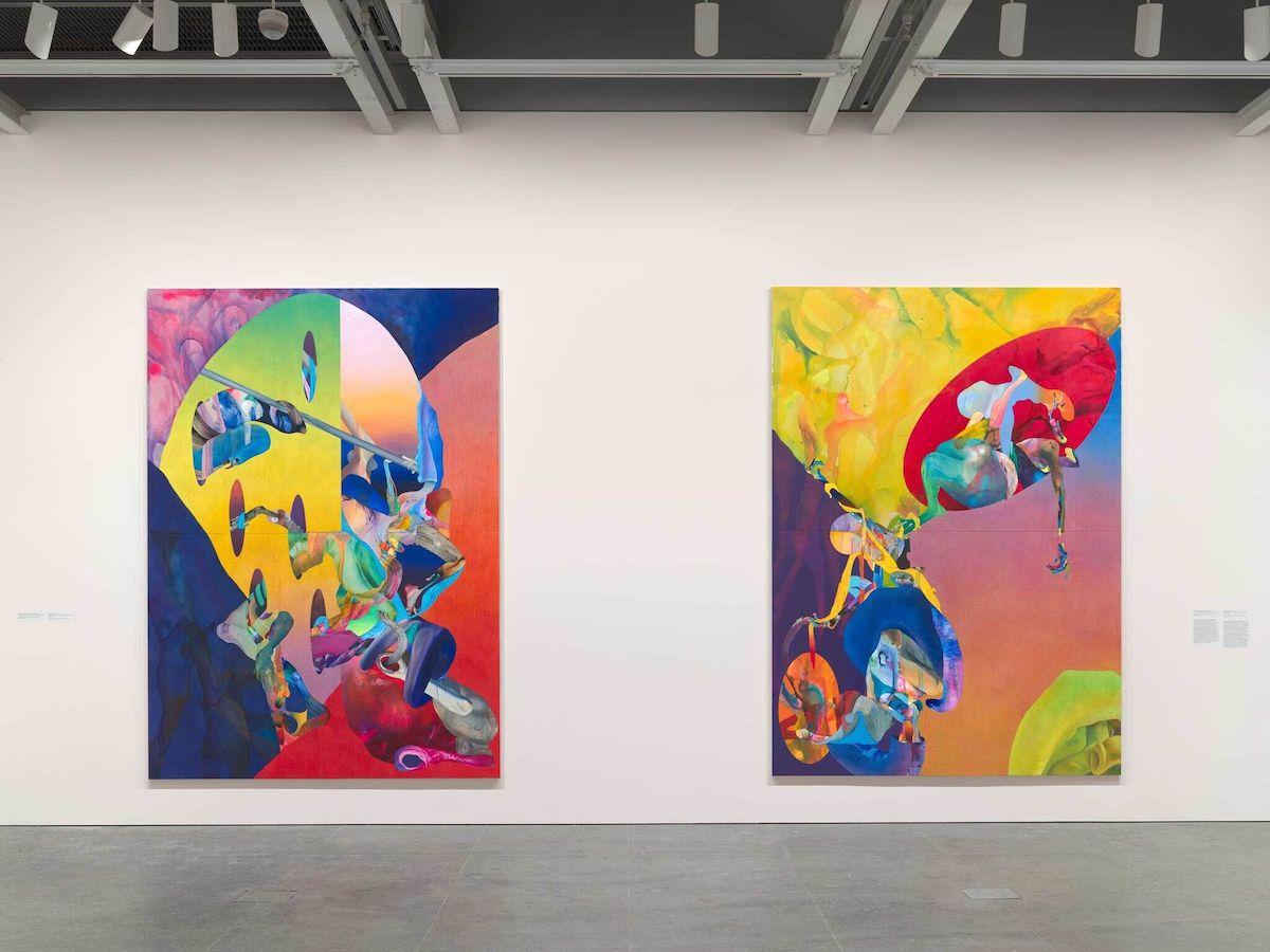 Installation view of Ilana Savdie: Radical Contractions (Whitney Museum of American Art, New York, July 14 – November 5, 2023). From left to right: Pico y placa, 2023; Tickling the Before and After, 2023.