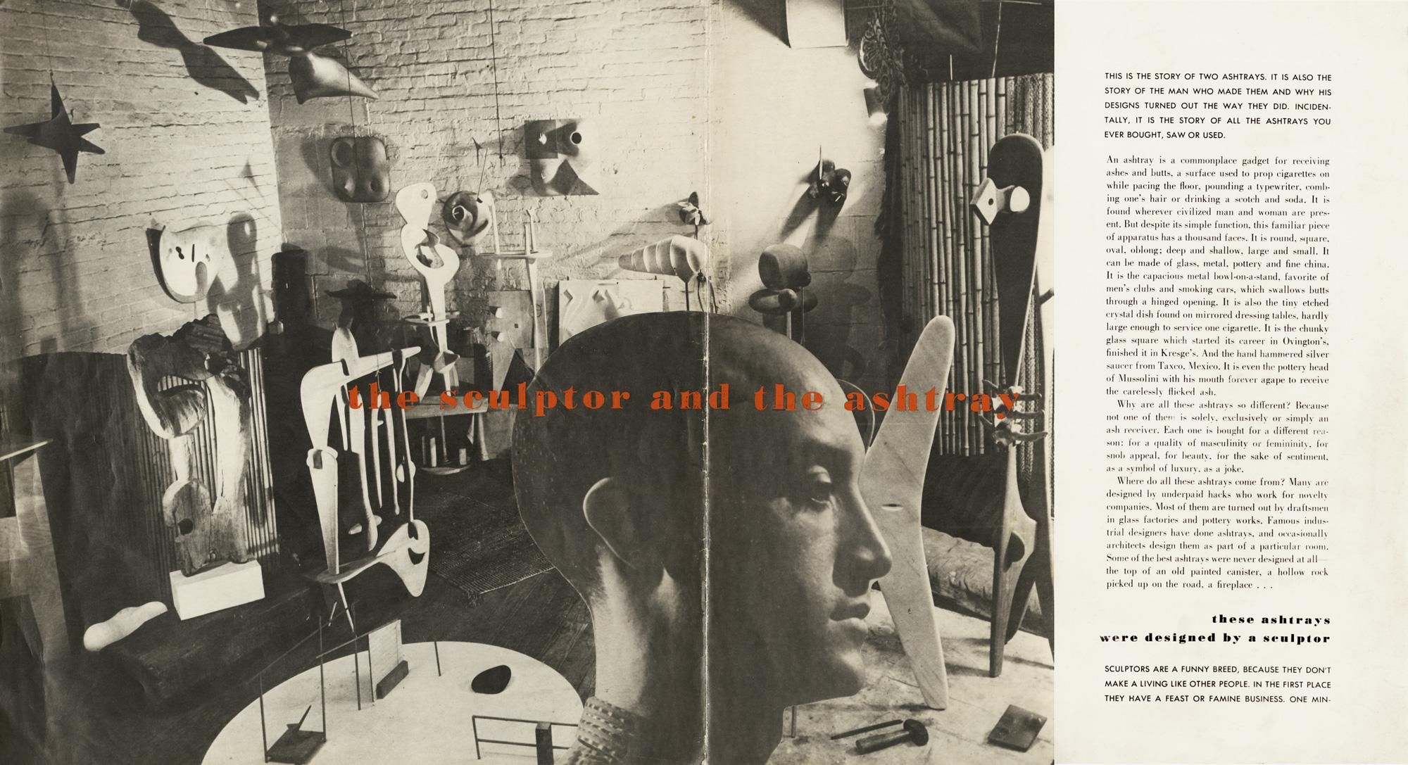 Ashtray design by Isamu Noguchi, pictured in unpublished magazine article by Mary Mix, “The Sculptor and the Ashtray,” c. 1944.