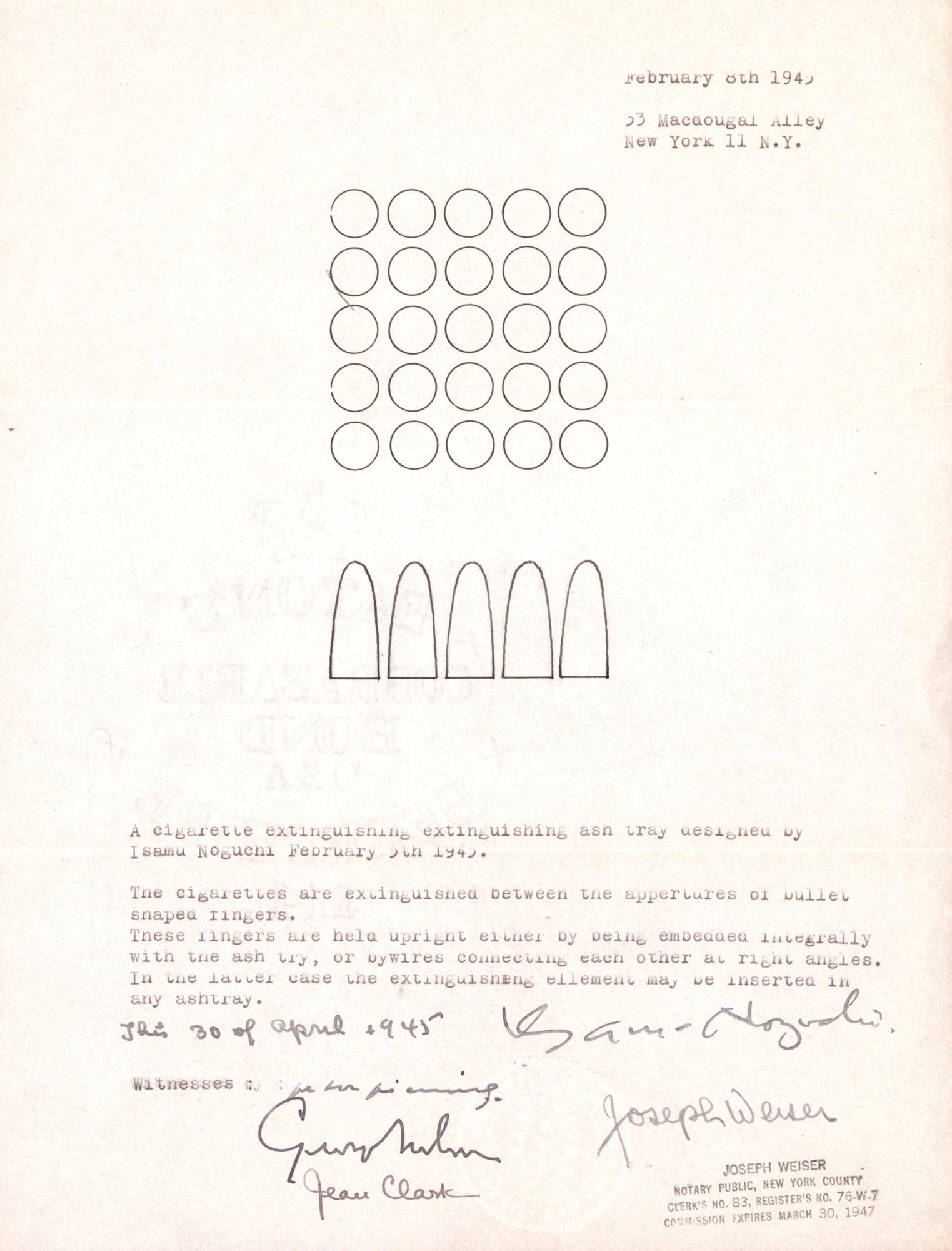 Notarized design drawing dated February 8, 1945, for a patent application for an ashtray design by Isamu Noguchi.