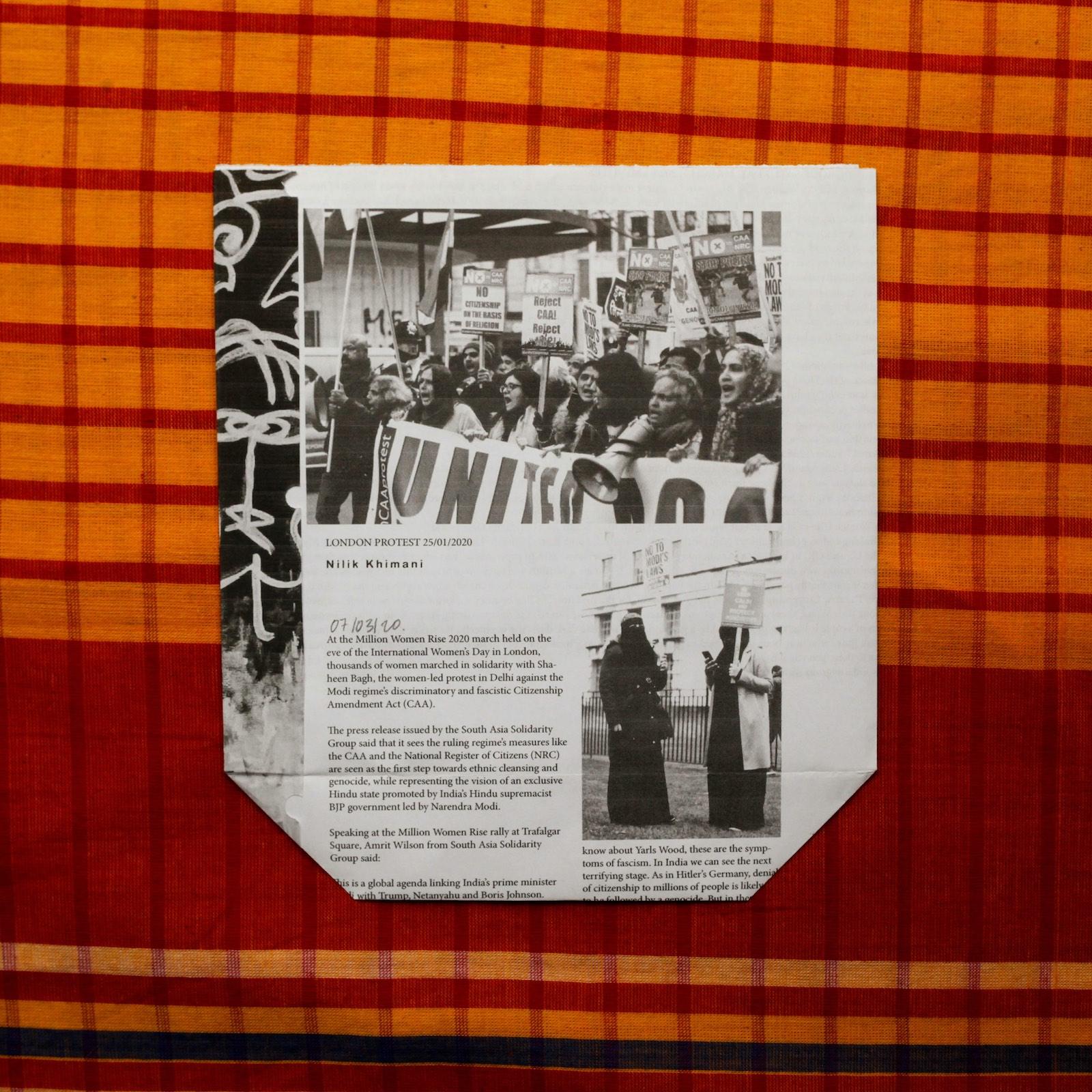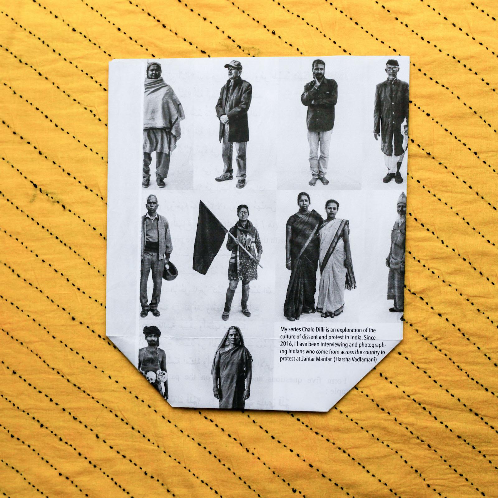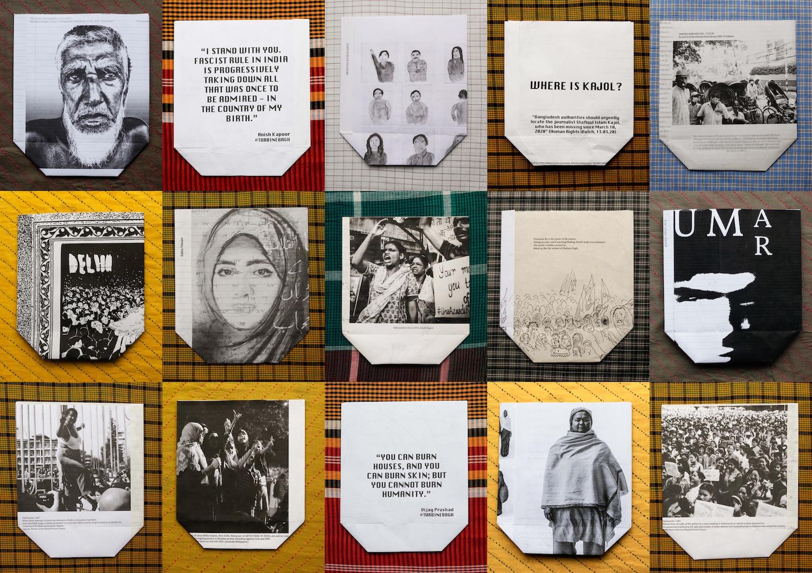 Karim was shortlisted for the Jameel Prize for Turbine Bagh which includes the installation Samosa Packets, a collection of paper bags crafted from photographs, poems, and newspapers that aim to create awareness on specific political issues such as feminism, Nepal’s women resistance, and the CAA. Traditionally, samosa packets are crafted with discarded papers and quickly thrown away. The purpose of Karim’s samosa packets is the opposite: these packets are to be seen and acknowledged. The packaging becomes, for once, more important than the content. “My family—three generations of us—are part of this work. Everything was made in my mother’s house whilst cooking, childcare, and daily comings and goings continued. The Free Shahidul campaign meetings for my uncle also happened in that house. My work, family, and activism are all combined.” Yet, it is not only a family affair. International figures such as British sculptor Sir Anish Kapoor, Indian author Arundhati Roy, and actress Sharon Stone, among many others, have supported Turbine Bagh and the Samosa Packets movements.