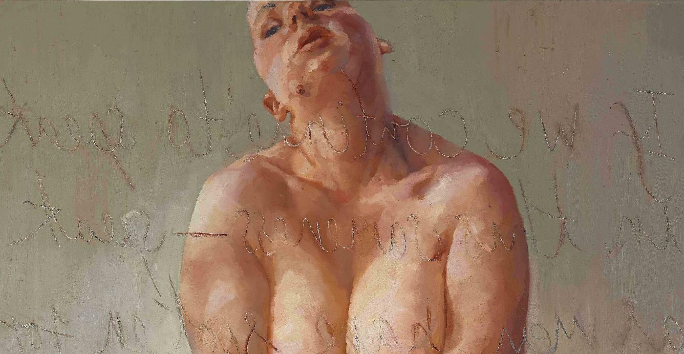 Standing at seven by six feet, the towering canvas presents an intimate and unflinching view of the female body. Defying beauty standards and the tradition of the male gaze in painting, Propped is a realistic portrayal of the female body, painted from the female perspective. The subject (Saville) looks at herself in a foggy mirror, through text she has written on the glass: a quote from “When Our Lips Speak Together”, an essay by the French feminist Luce Irigaray, which appears in reverse to the viewer. The text, which addresses how women's communication and self-representation should not serve the patriarchal system, is inscribed in the paint itself and appears to be written on the flesh as well.