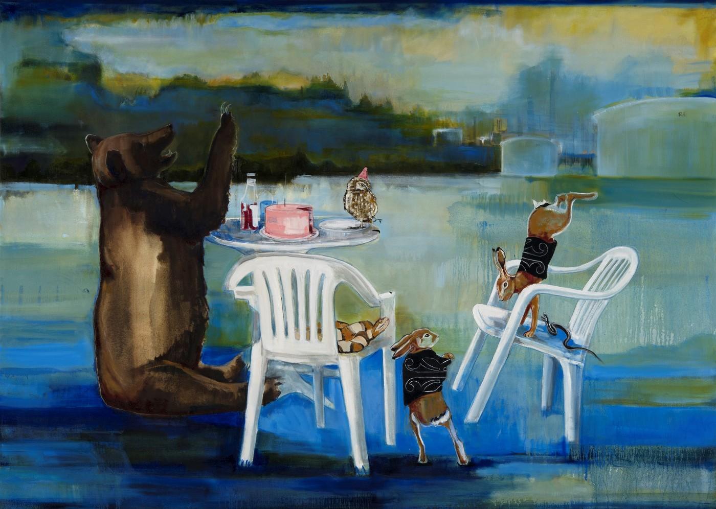 In A Little Medicine and Magic, a woman with a coyote's head, dressed in a vintage 1950s-style pink dress, appears to be scolding five skunks, balancing on each other's backs. The top skunk is holding the woman’s bright red purse, while the bottom skunk, holding a lipstick, has obviously been experimenting with cosmetics. All the skunks have patches of red lipstick adorning a cheek, haunch, or tail. The tonally varied blue background, which could be a cloudy seaside evening or an artistically embellished wall, adds to the mysterious, magical feel. The anthropomorphized animals, and the naughtiness of skunks caught playing with lipstick, evokes the wonder at the heart of childhood stories and memories, while the coyote-woman adds layers of ancient myth and social commentary.