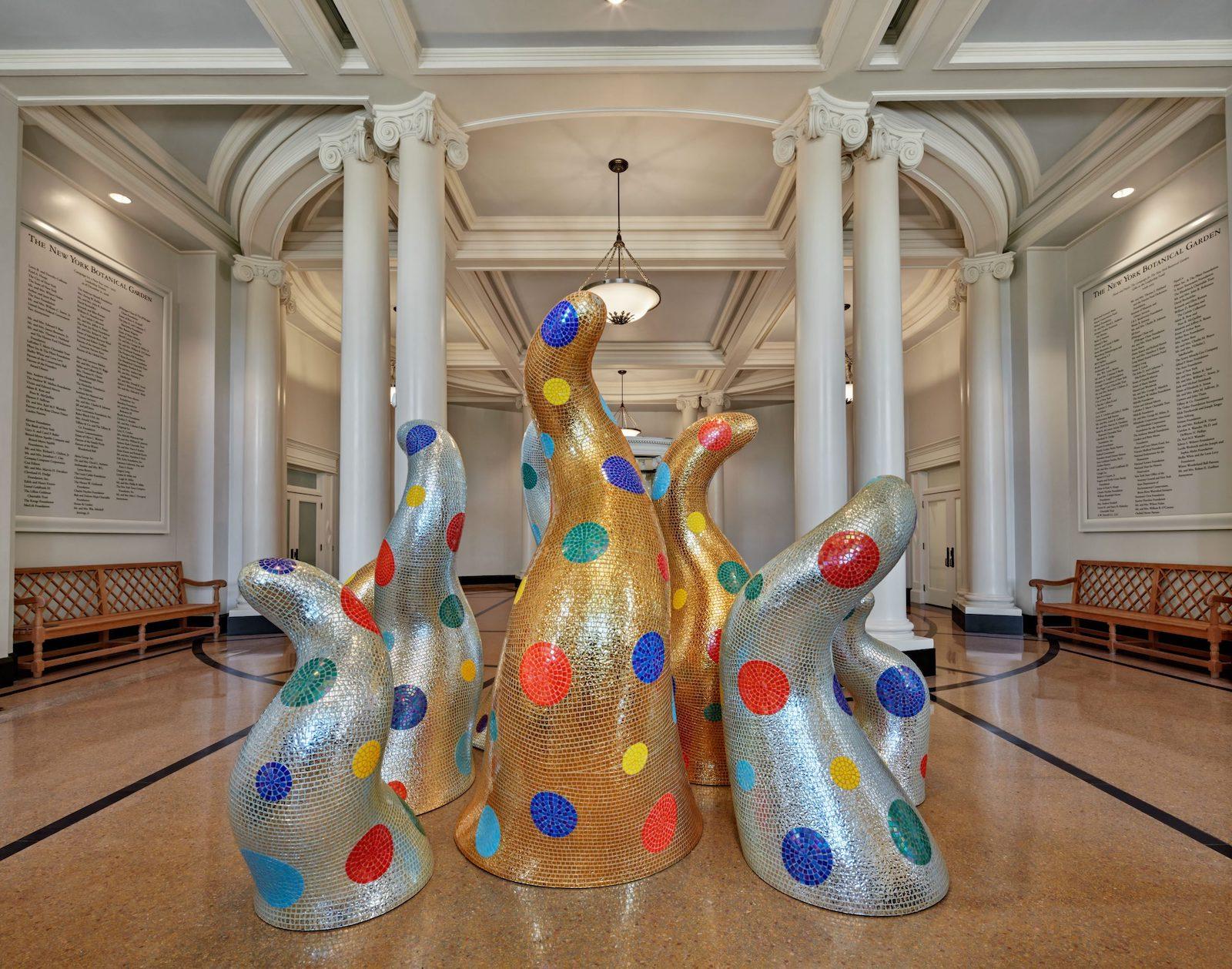 When Yayoi Kusama established herself in New York City in 1958, the first thing she did was visit the Empire State Building. She climbed the landmark, looked out at the astonishing city, and, as she recalled in an earlier interview republished with Artspace, “aspired to grab everything that went on in the city and become a star. ” It is appropriate, then, that one of the opening works in KUSAMA: Cosmic Nature at the New York Botanical Garden (April 10–October 31, 2021) is a star-like creature, wavering above a reflecting pool. Perched above the placid, mirror-like surface, without touching the water, it feels anxious, but welcoming.