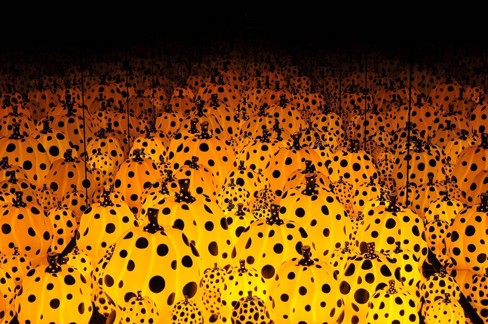 The exhibition continues, sprawling out across the large campus and indoor galleries. Tulip-shaped sculptures leap out from very real water lilies; you trawl through a floral-themed obliteration room, looking for the perfect spot for your sticker. In Pumpkins Screaming About Love Beyond Infinity, mottled pumpkins light up in an infinite procession that grows and grows until it is extinguished.