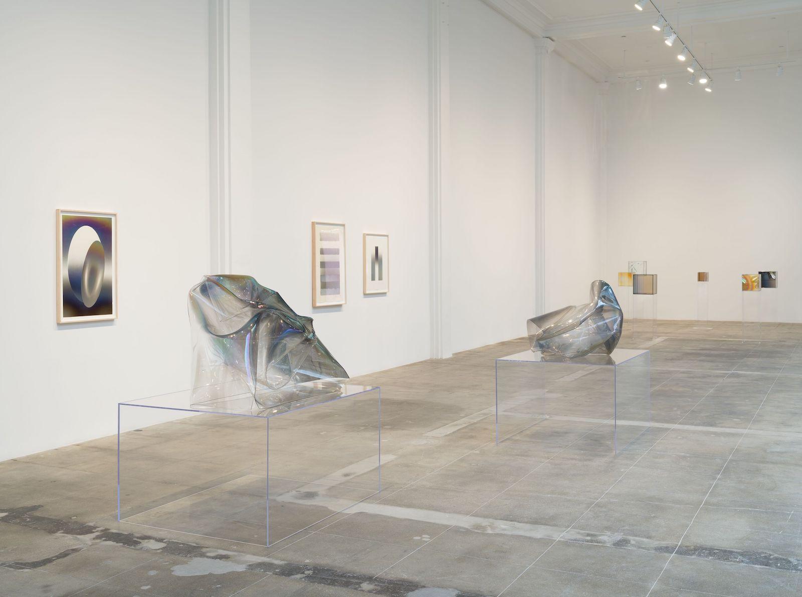 Best known for his Abstract Expressionist dismembered car sculptures, Chamberlain, who died in 2011, presents a series of plexiglass boxes. Softened through heating, they curl in on themselves and are coated with the same vaporized particles as Bell’s cubes.