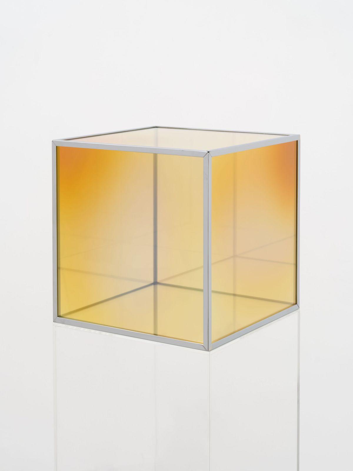 Larry Bell, Golden 1969/2022. Coated glass with chrome edging. 31 x 31 x 31 cm. (12 1/4 x 12 1/4 x 12 1/4 in.).