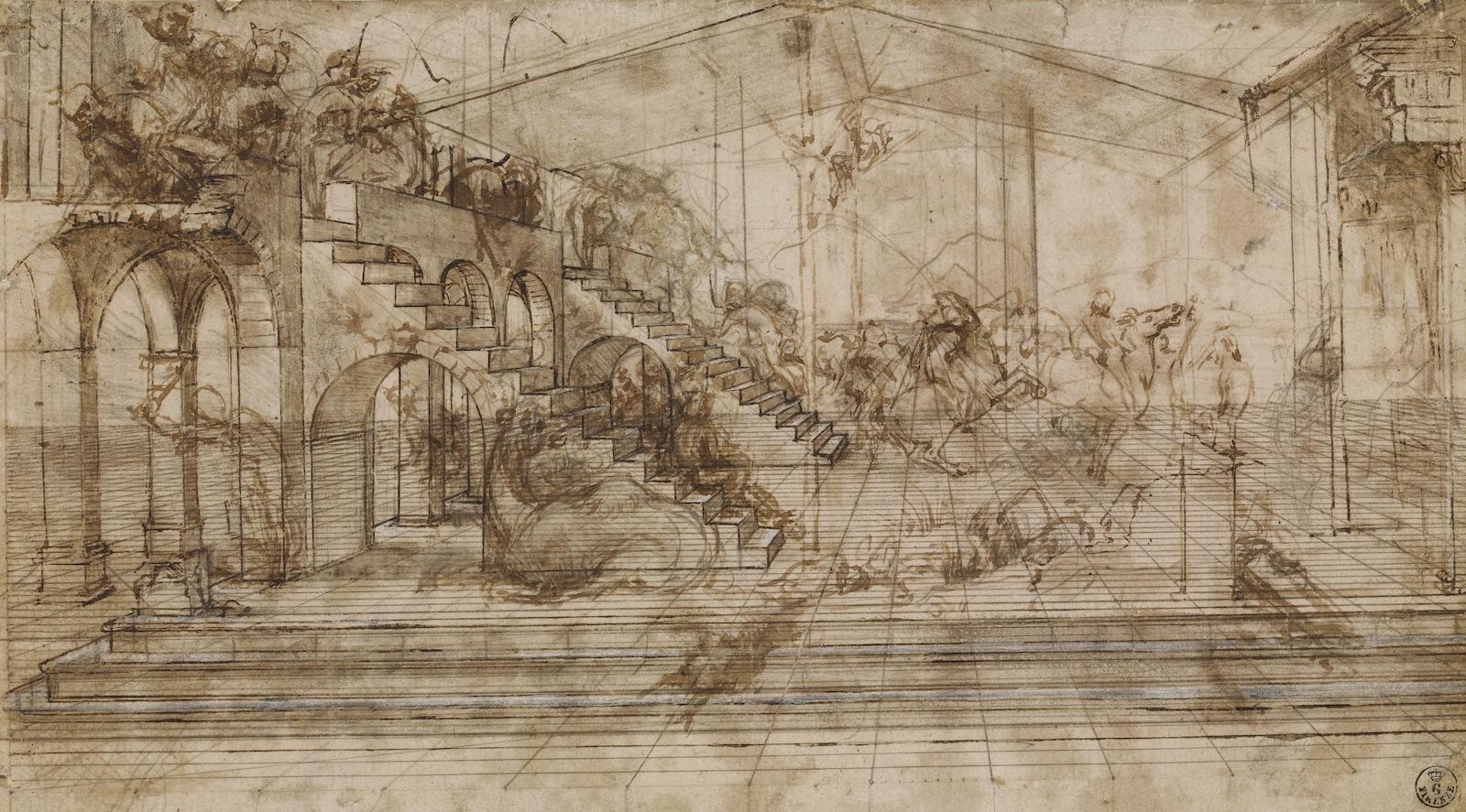 Leonardo, study for the unfinished Adoration of the Magi, ca. 1481, 16.4 x 29.1 cm. "The artist drew the architecture first, based on a preliminary construction done with pin pricks for measurements, compass work, leadpoint, stylus-ruled and pen-and-ink ruling as an underdrawing. This was followed by the figures and animals drawn in pen with medium and dark brown inks, brush and grayish-brown wash, with partial reworkings by the artist in black chalk, over an extensive freehand lead point under drawing; on the overall design some traces of white gouache used to correct forms especially in the foreground."