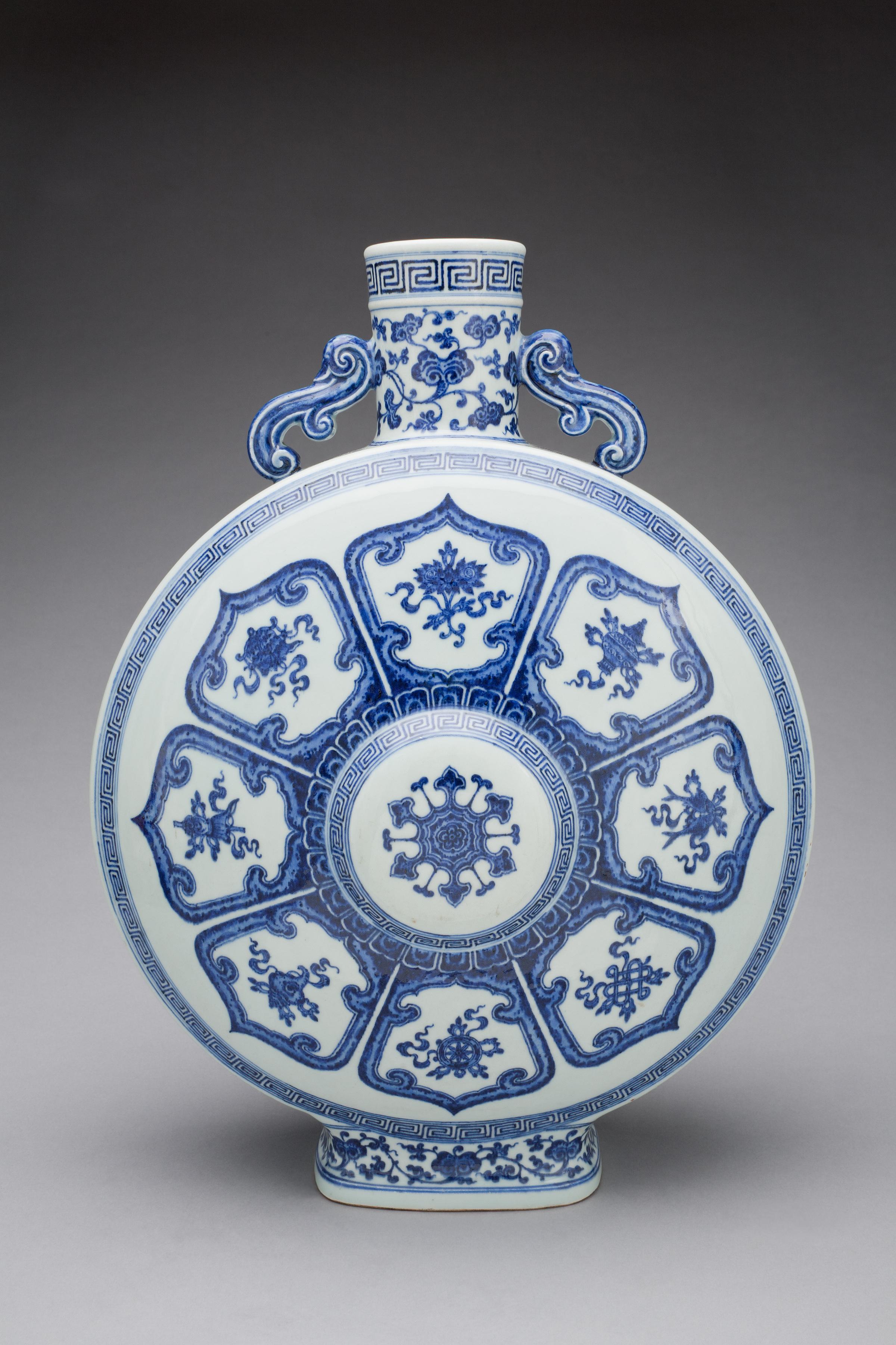 Moon Flask, Qianlong period, Qing Dynasty (1644–1911), China, about 1736–1795. Porcelain with underglaze blue; 19-1/2 x 15 x 8 in. Denver Art Museum: Gift of May Wilfley in memory of her parents, A.R. Wilfley and Addie M. Wilfley, 1974.28
