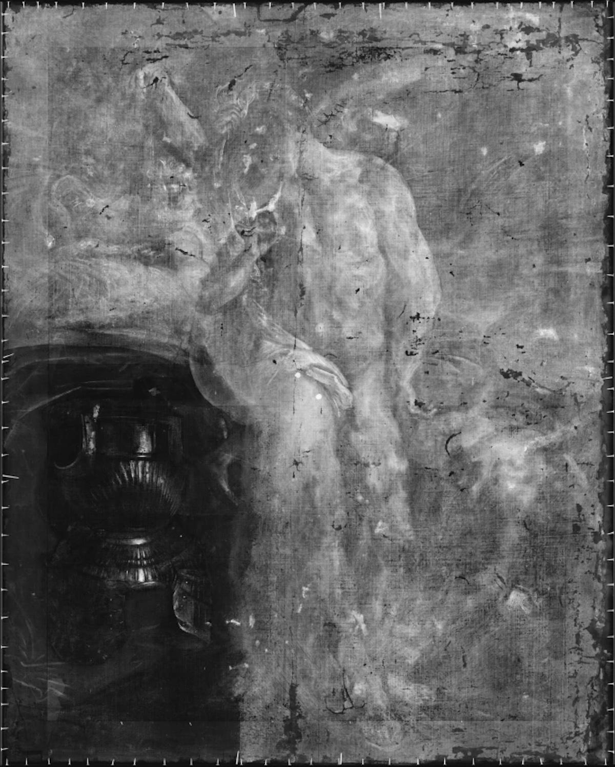 X-ray analysis of the work confirms Rubens’ process of painting: the figure of Saint Sebastian originally had his torso twisted to the left and his right arm bent over his head. His feet were positioned further left than in the finished version, and his right knee can be seen where the lower part of the tree is. Other small changes include an arrow in the saint’s right thigh and a change that can be seen in normal light in the right wing of the kneeling angel.