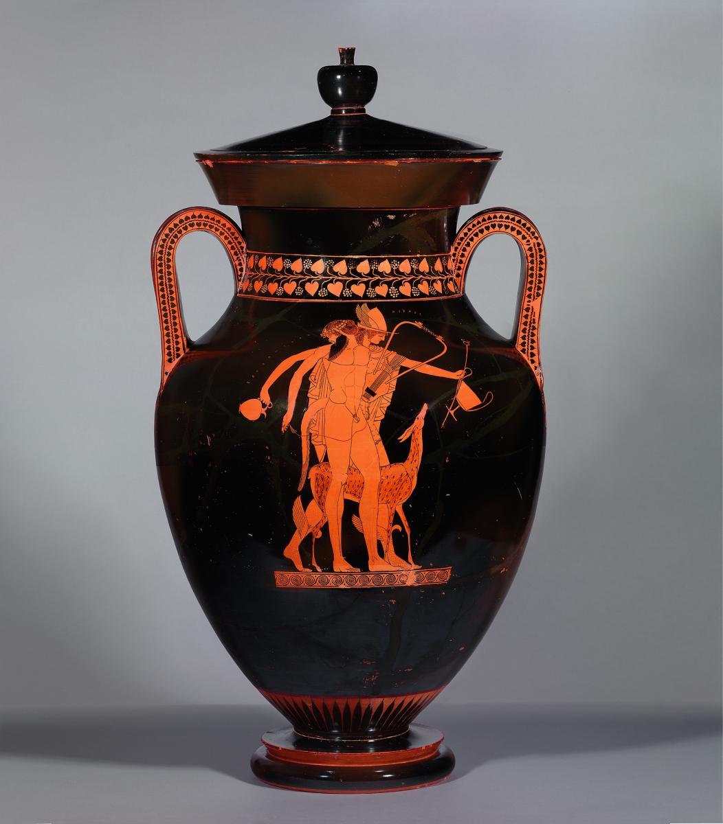 The Berlin Painter’s namesake vase of a satyr with the god, Hermes. Red figure amphora, 500-490 BCE. Now housed in the Staatliche Museen in Berlin.